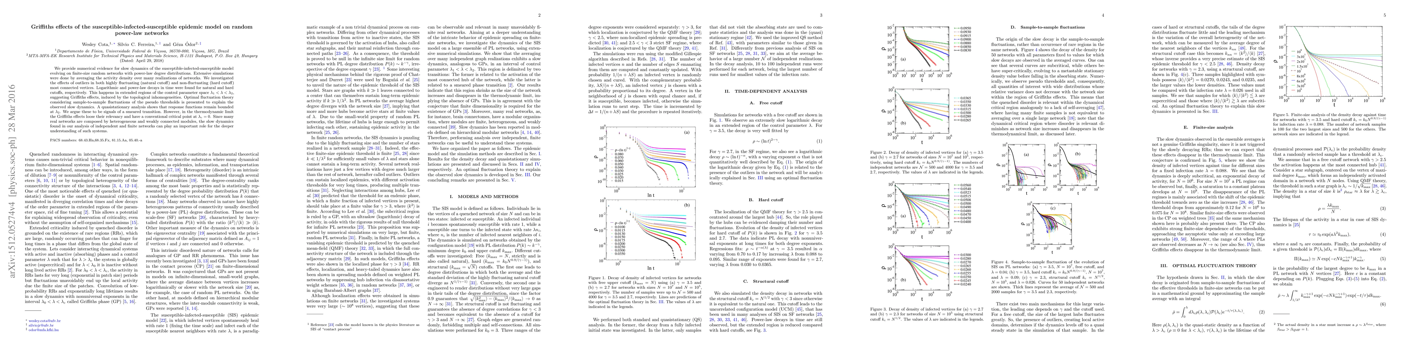 We provide numerical evidence for slow dynamics of the susceptible-infected-susceptible model evolving on finite-size random networks with power-law degree distributions. Extensive simulations were done by averaging the activity density over many realizations of networks. We investigated the effects of outliers in both highly fluctuating (natural cutoff) and non-fluctuating (hard cutoff) most connected vertices. Logarithmic and power-law decays in time were found for natural and hard cutoffs, respectively. This happens in extended regions of the control parameter space $\lambda_1<\lambda<\lambda_2$, suggesting Griffiths effects, induced by the topological inhomogeneities. Optimal fluctuation theory considering sample-to-sample fluctuations of the pseudo thresholds is presented to explain the observed slow dynamics. A quasistationary analysis shows that response functions remain bounded at $\lambda_2$. We argue these to be signals of a smeared transition. However, in the thermodynamic limit the Griffiths effects loose their relevancy and have a conventional critical point at $\lambda_c=0$. Since many real networks are composed by heterogeneous and weakly connected modules, the slow dynamics found in our analysis of independent and finite networks can play an important role for the deeper understanding of such systems.