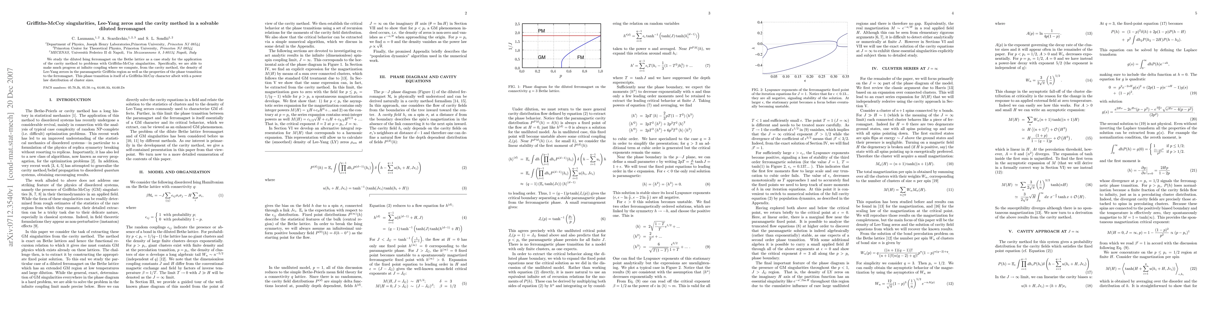 This paper investigates the diluted Ising ferromagnet on the Bethe lattice using the cavity method, focusing on Griffiths-McCoy singularities and Lee-Yang zeros. It computes the density of Lee-Yang zeroes and characterizes the phase transition to ferromagnetism, revealing a Griffiths-McCoy nature with a power law distribution of cluster sizes.