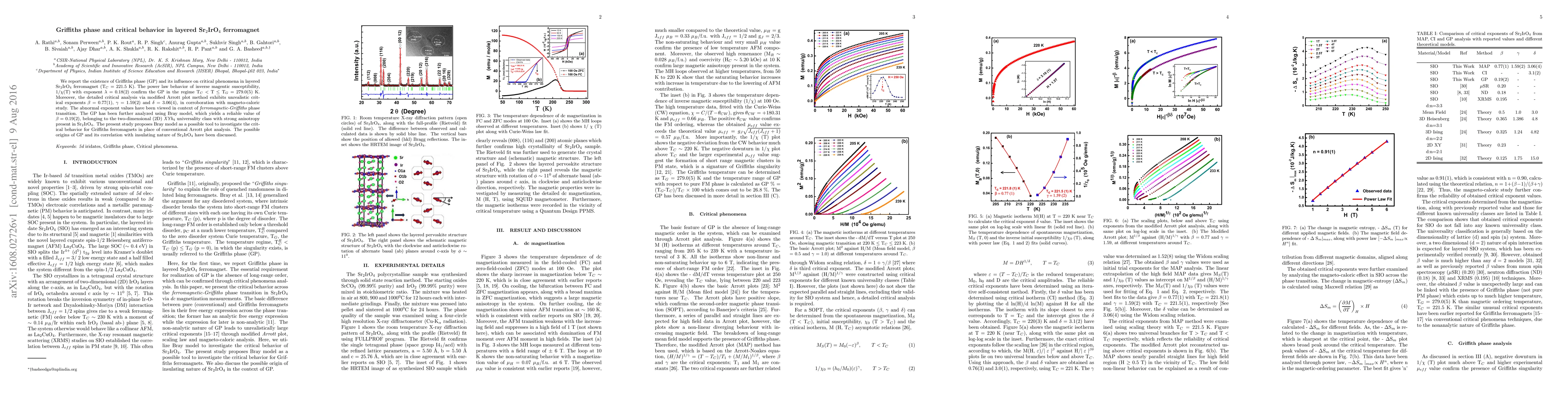 The study reports the presence of a Griffiths phase in Sr$_2$IrO$_4$ ferromagnet, evidenced by a power law in inverse magnetic susceptibility and unconventional critical exponents. The Bray model is proposed as a better method to analyze the critical behavior compared to conventional Arrott plots.