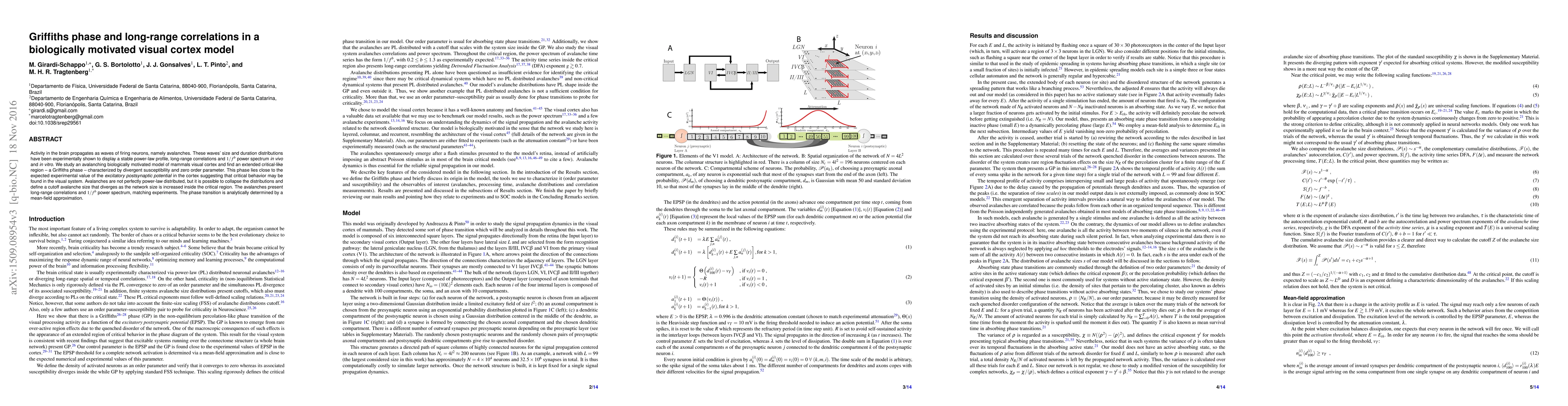 Activity in the brain propagates as waves of firing neurons, namely avalanches. These waves' size and duration distributions have been experimentally shown to display a stable power-law profile, long-range correlations and $1/f^{b}$ power spectrum \textit{in vivo} and \textit{in vitro}. We study an avalanching biologically motivated model of mammals visual cortex and find an extended critical-like region -- a Griffiths phase -- characterized by divergent susceptibility and zero order parameter. This phase lies close to the expected experimental value of the \textit{excitatory postsynaptic potential} in the cortex suggesting that critical behavior may be found in the visual system. Avalanches are not perfectly power-law distributed, but it is possible to collapse the distributions and define a cutoff avalanche size that diverges as the network size is increased inside the critical region. The avalanches present long-range correlations and $1/f^{b}$ power spectrum, matching experiments. The phase transition is analytically determined by a mean-field approximation.