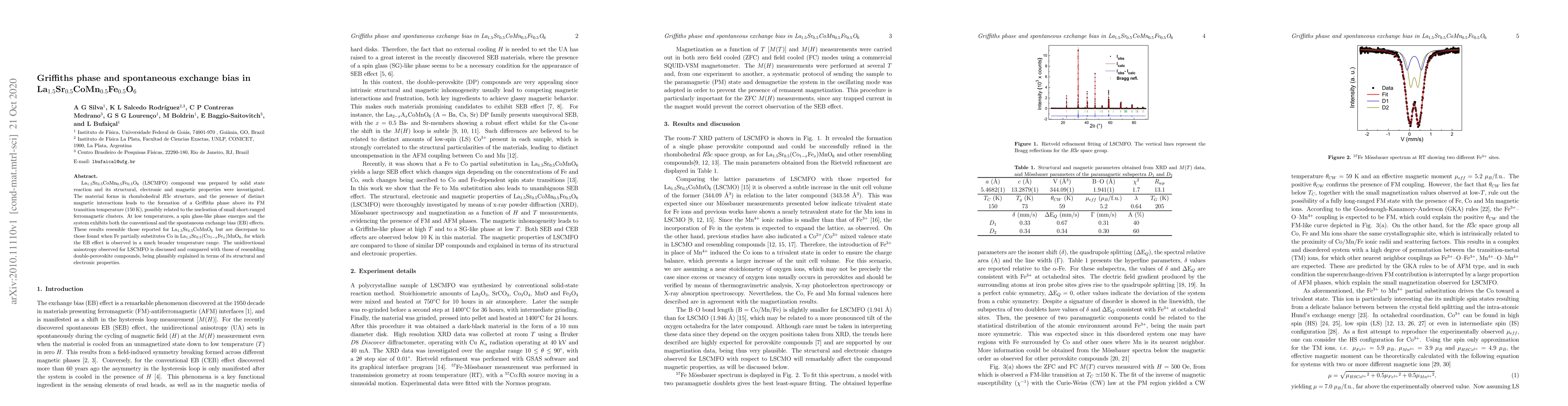 Researchers investigated La$_{1.5}$Sr$_{0.5}$CoMn$_{0.5}$Fe$_{0.5}$O$_{6}$ compound, discovering a Griffiths phase above its magnetic transition temperature and exhibiting spontaneous exchange bias effects at low temperatures.
