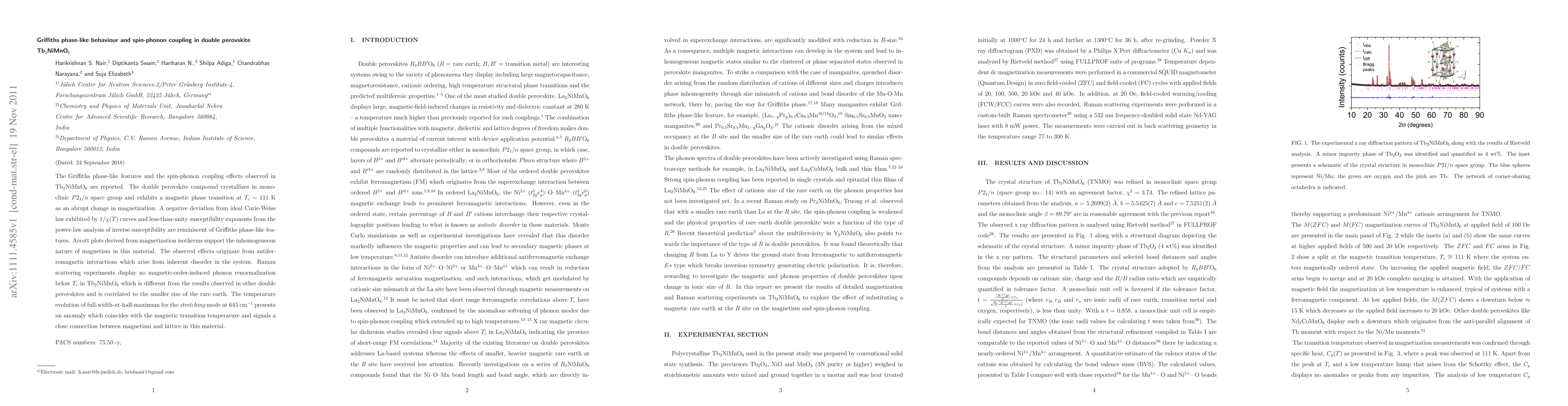 This study reports Griffiths phase-like behavior and spin-phonon coupling in the double perovskite Tb$_2$NiMnO$_6$, revealing a magnetic phase transition at 111 K and a negative deviation from the Curie-Weiss law indicative of Griffiths phase features. The material shows no magnetic-order-induced phonon renormalization, but an anomaly in the temperature evolution of a specific phonon mode suggests a strong magnetism-lattice interaction.