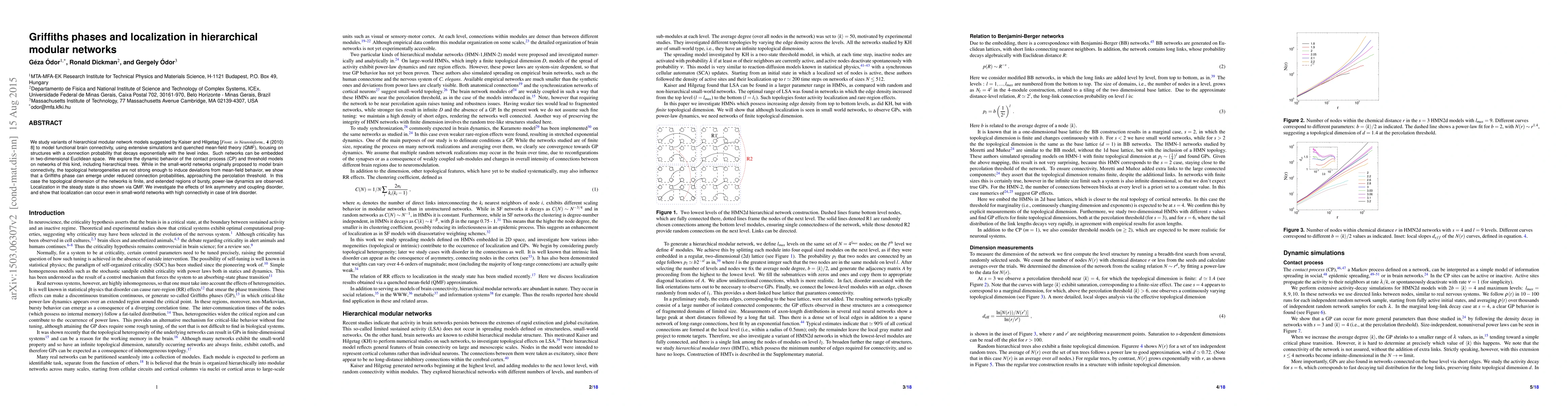 We study variants of hierarchical modular network models suggested by Kaiser and Hilgetag [Frontiers in Neuroinformatics, 4 (2010) 8] to model functional brain connectivity, using extensive simulations and quenched mean-field theory (QMF), focusing on structures with a connection probability that decays exponentially with the level index. Such networks can be embedded in two-dimensional Euclidean space. We explore the dynamic behavior of the contact process (CP) and threshold models on networks of this kind, including hierarchical trees. While in the small-world networks originally proposed to model brain connectivity, the topological heterogeneities are not strong enough to induce deviations from mean-field behavior, we show that a Griffiths phase can emerge under reduced connection probabilities, approaching the percolation threshold. In this case the topological dimension of the networks is finite, and extended regions of bursty, power-law dynamics are observed. Localization in the steady state is also shown via QMF. We investigate the effects of link asymmetry and coupling disorder, and show that localization can occur even in small-world networks with high connectivity in case of link disorder.