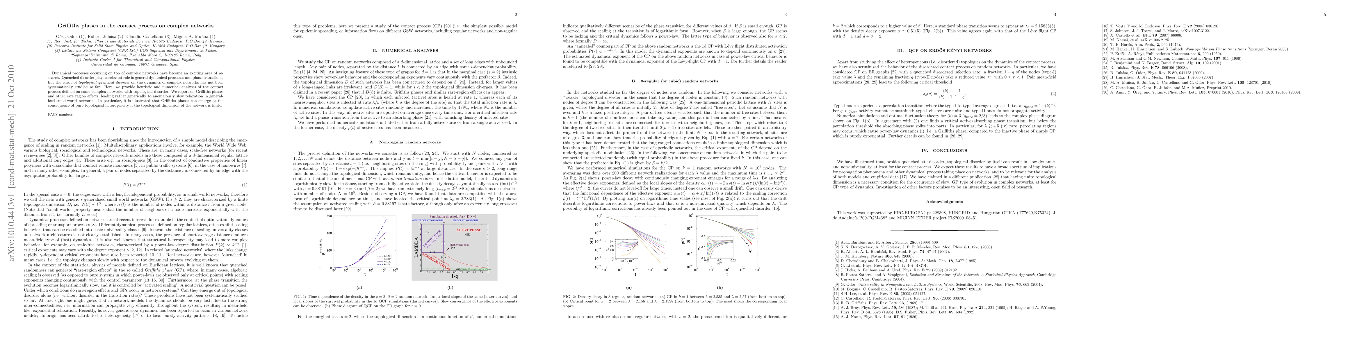 The study examines the contact process (CP) on complex networks with topological disorder, using numerical simulations and heuristic analyses to explore Griffiths phases and rare region effects.