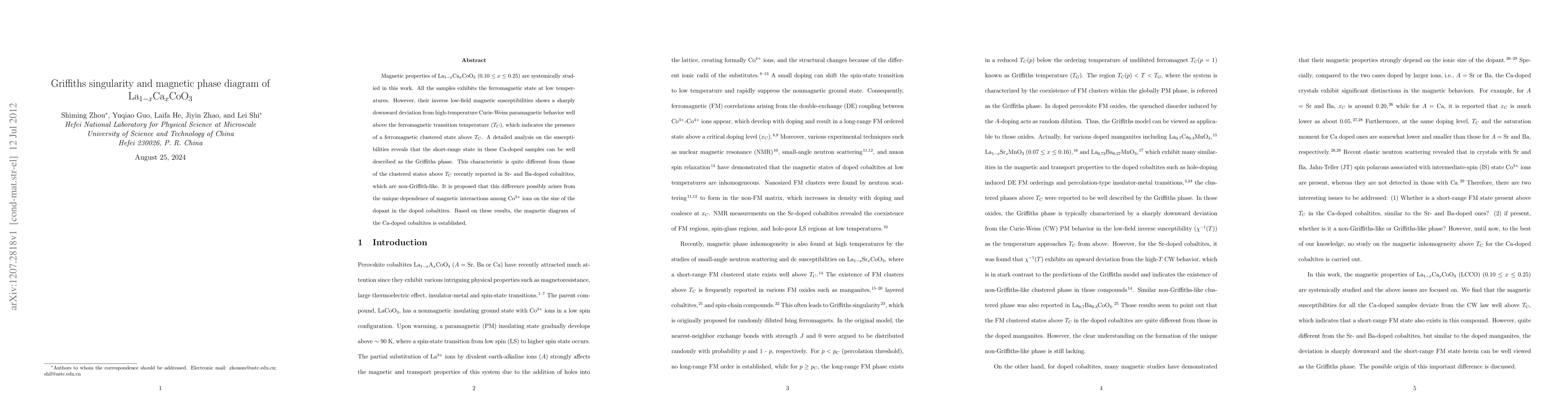 Magnetic properties of La$_{1-x}$Ca$_{x}$CoO$_{3}$ (0.10 $\leq x\leq$ 0.25) are systemically studied in this work. All the samples exhibits the ferromagnetic state at low temperatures. However, their inverse low-field magnetic susceptibilities shows a sharply downward deviation from high-temperature Curie-Weiss paramagnetic behavior well above the ferromagnetic transition temperature ($T_C$), which indicates the presence of a ferromagnetic clustered state above $T_C$. A detailed analysis on the susceptibilities reveals that the short-range state in these Ca-doped samples can be well described as the Griffiths phase. This characteristic is quite different from those of the clustered states above $T_C$ recently reported in Sr- and Ba-doped cobaltites, which are non-Griffith-like. It is proposed that this difference possibly arises from the unique dependence of magnetic interactions among Co$^{3+}$ ions on the size of the dopant in the doped cobaltites. Based on these results, the magnetic diagram of the Ca-doped cobaltites is established.