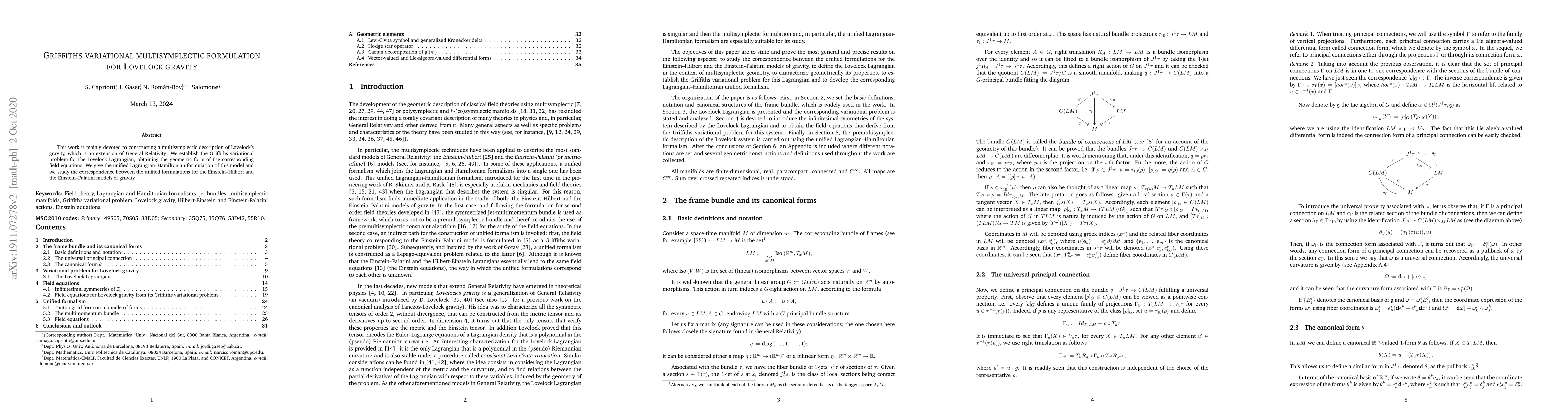 This paper develops a multisymplectic description of Lovelock gravity, a modified theory of General Relativity, using the Griffiths variational formulation. It establishes unified Lagrangian-Hamiltonian formulations for various gravity models, shedding light on their underlying symmetries.