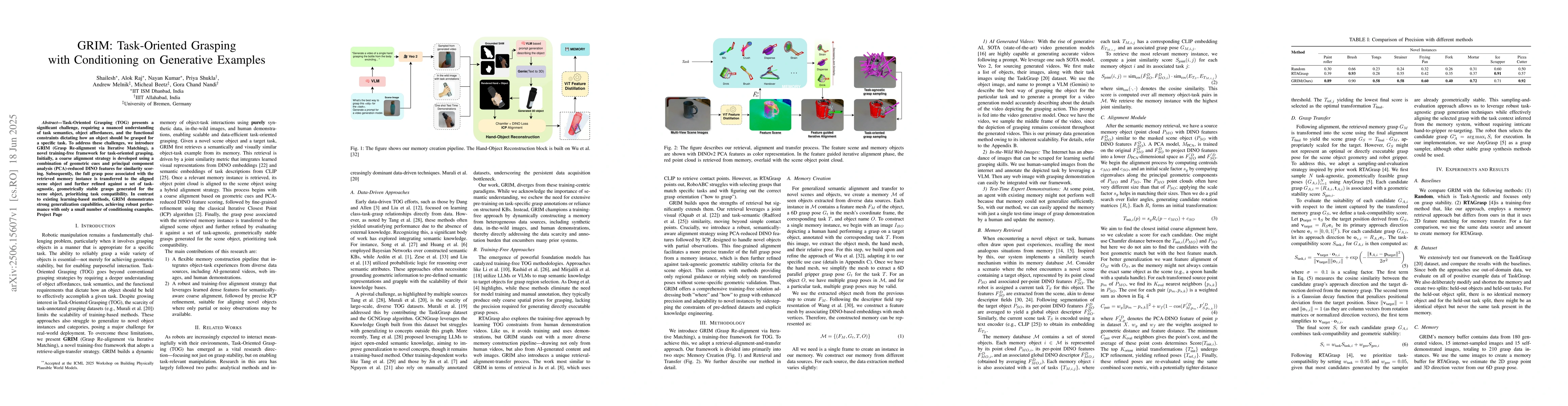 Task-Oriented Grasping (TOG) presents a significant challenge, requiring a nuanced understanding of task semantics, object affordances, and the functional constraints dictating how an object should be grasped for a specific task. To address these challenges, we introduce GRIM (Grasp Re-alignment via Iterative Matching), a novel training-free framework for task-oriented grasping. Initially, a coarse alignment strategy is developed using a combination of geometric cues and principal component analysis (PCA)-reduced DINO features for similarity scoring. Subsequently, the full grasp pose associated with the retrieved memory instance is transferred to the aligned scene object and further refined against a set of task-agnostic, geometrically stable grasps generated for the scene object, prioritizing task compatibility. In contrast to existing learning-based methods, GRIM demonstrates strong generalization capabilities, achieving robust performance with only a small number of conditioning examples.