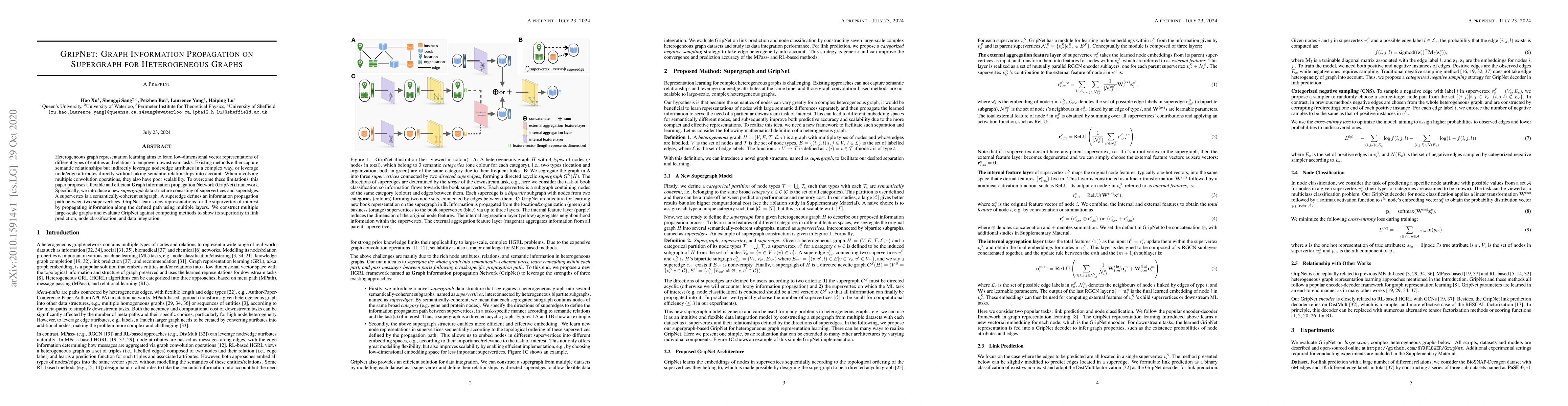 Heterogeneous graph representation learning aims to learn low-dimensional vector representations of different types of entities and relations to empower downstream tasks. Existing methods either capture semantic relationships but indirectly leverage node/edge attributes in a complex way, or leverage node/edge attributes directly without taking semantic relationships into account. When involving multiple convolution operations, they also have poor scalability. To overcome these limitations, this paper proposes a flexible and efficient Graph information propagation Network (GripNet) framework. Specifically, we introduce a new supergraph data structure consisting of supervertices and superedges. A supervertex is a semantically-coherent subgraph. A superedge defines an information propagation path between two supervertices. GripNet learns new representations for the supervertex of interest by propagating information along the defined path using multiple layers. We construct multiple large-scale graphs and evaluate GripNet against competing methods to show its superiority in link prediction, node classification, and data integration.