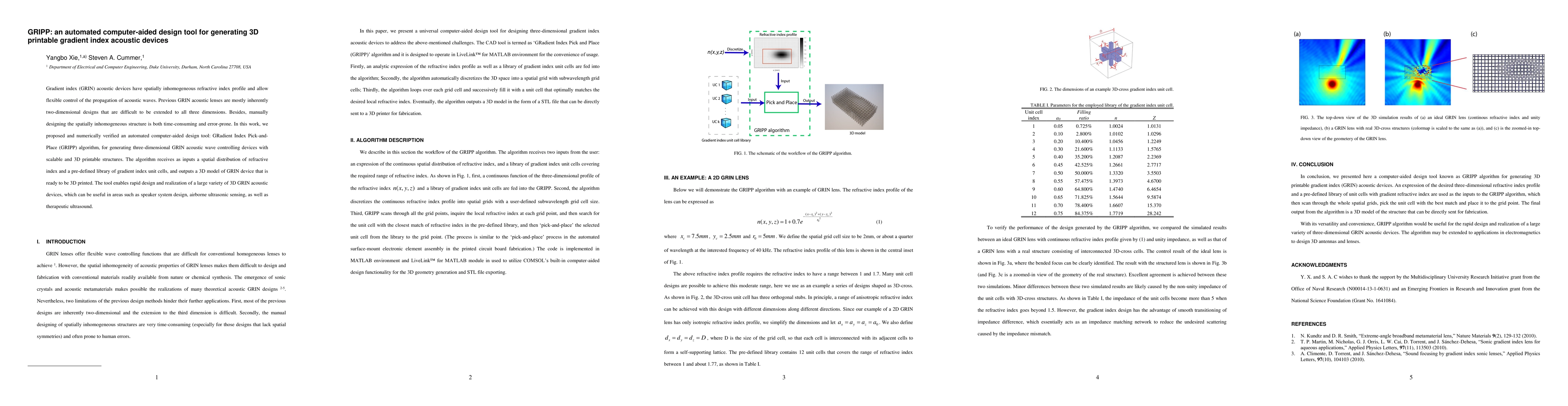 The GRIPP algorithm is an automated computer-aided design tool for generating 3D printable gradient index acoustic devices, enabling scalable and efficient design of complex 3D GRIN structures for applications in speaker systems, ultrasonic sensing, and therapeutic ultrasound.