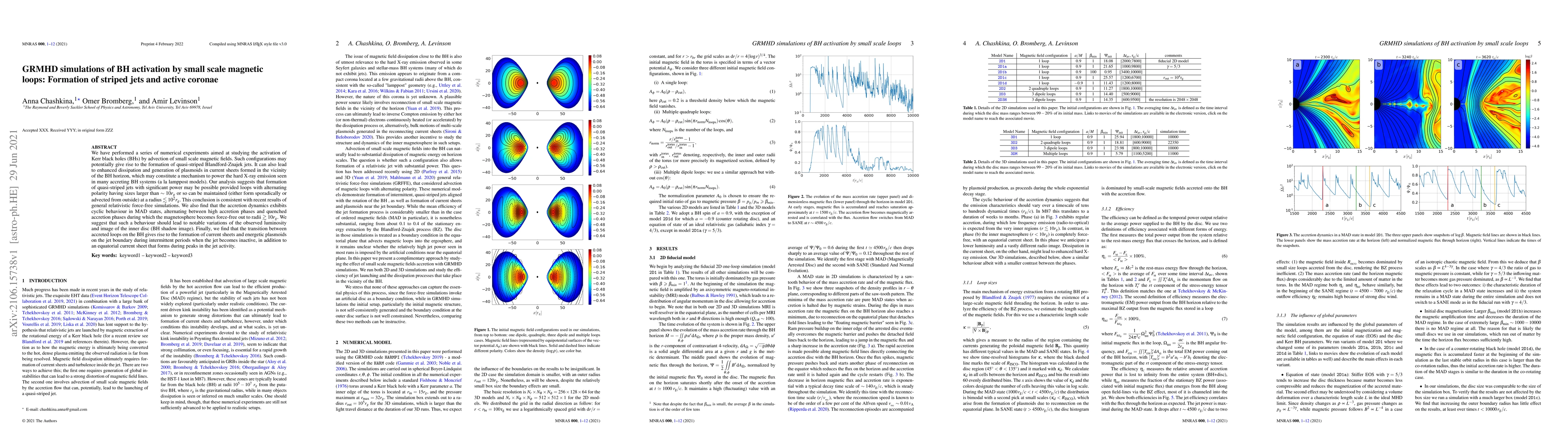 We have performed a series of numerical experiments aimed at studying the activation of Kerr black holes (BHs) by advection of small scale magnetic fields. Such configurations may potentially give rise to the formation of quasi-striped Blandford-Znajek jets. It can also lead to enhanced dissipation and generation of plasmoids in current sheets formed in the vicinity of the BH horizon, which may constitute a mechanism to power the hard X-ray emission seen in many accreting BH systems (a la lamppost models). Our analysis suggests that formation of quasi-striped jets with significant power may be possible provided loops with alternating polarity having sizes larger than $\sim 10 r_g$ or so can be maintained (either form sporadically or advected from outside) at a radius $\lesssim 10^2 r_g$. This conclusion is consistent with recent results of general relativistic force-free simulations. We also find that the accretion dynamics exhibits cyclic behaviour in MAD states, alternating between high accretion phases and quenched accretion phases during which the magnetosphere becomes force-free out to radii $\gtrsim 10r_g$. We suggest that such a behaviour should lead to notable variations of the observed luminosity and image of the inner disc (BH shadow image). Finally, we find that the transition between accreted loops on the BH gives rise to the formation of current sheets and energetic plasmoids on the jet boundary during intermittent periods when the jet becomes inactive, in addition to an equatorial current sheet that forms during peaks in the jet activity.