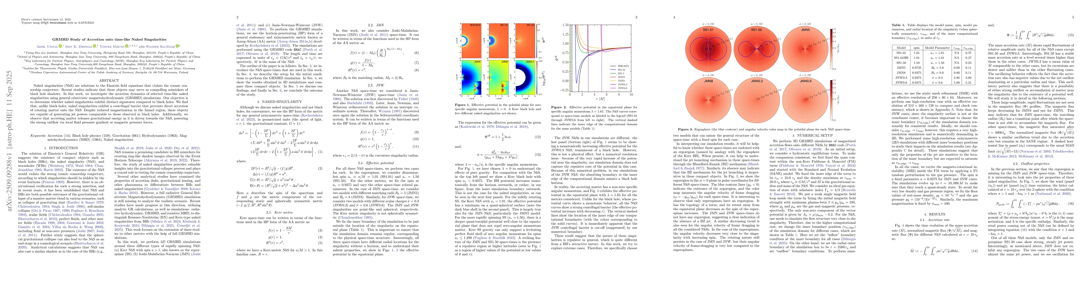 Naked singularities (NkS) are solutions to the Einstein field equations that violate the cosmic censorship conjecture. Recent studies indicate that these objects may serve as compelling mimickers of black hole shadows. In this work, we investigate the accretion dynamics of selected time-like naked singularities using general relativistic magnetohydrodynamic (GRMHD) simulations. Our objective is to determine whether naked singularities exhibit distinct signatures compared to black holes. We find that, unlike black holes, naked singularities exhibit a centrifugal barrier that prevents direct accretion of rotating matter onto the NkS. Despite reduced magnetization in the funnel region, these objects are capable of generating jet powers comparable to those observed in black holes. Additionally, we observe that accreting matter releases gravitational energy as it is driven towards the NkS, powering the strong outflow via local fluid pressure gradient or magnetic pressure forces.