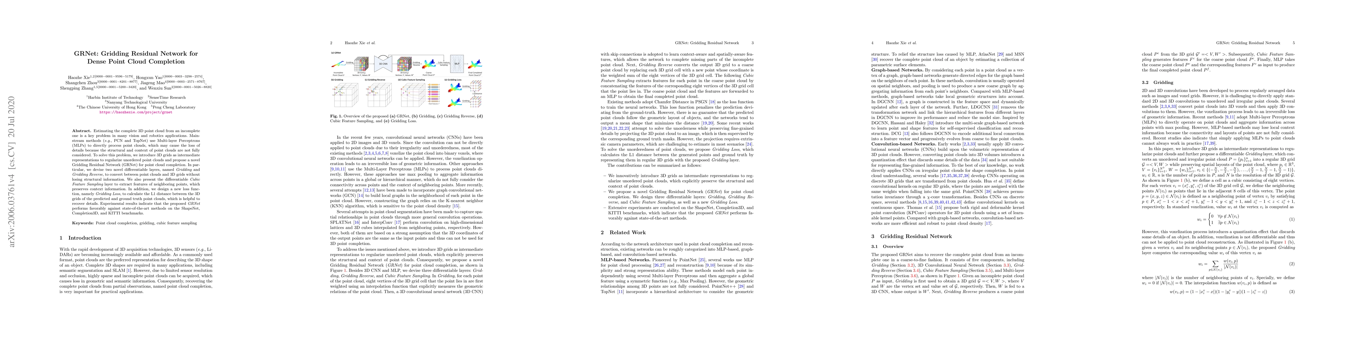 GRNet introduces a novel Gridding Residual Network for dense point cloud completion, utilizing 3D grids to better preserve structural and contextual information compared to MLP-based methods. The proposed network includes differentiable Gridding and Gridding Reverse layers, along with a Cubic Feature Sampling layer, and a Gridding Loss for detail recovery, achieving superior performance on benchmark datasets.