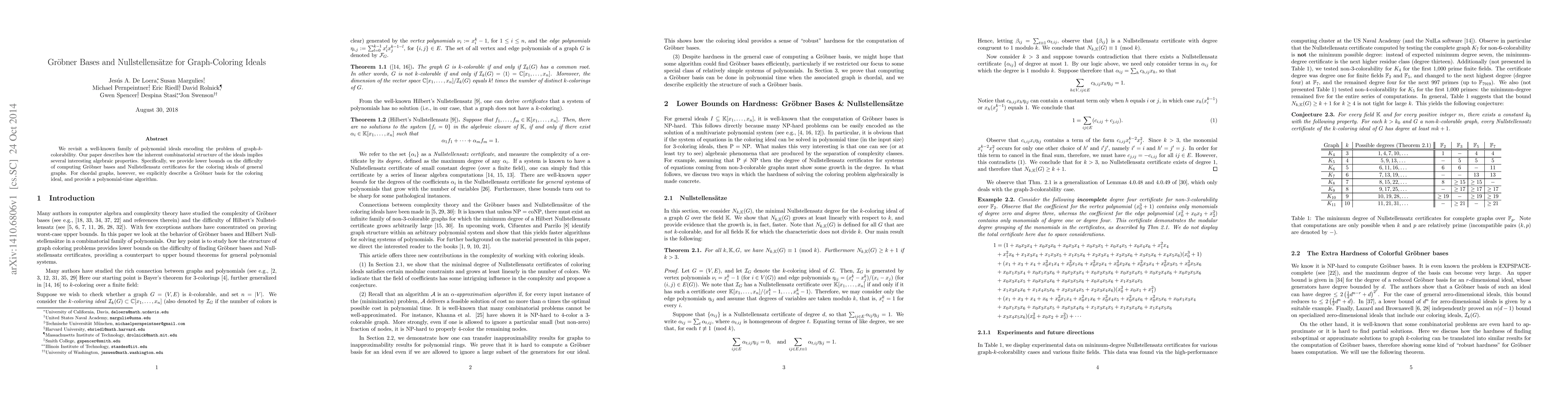 We revisit a well-known family of polynomial ideals encoding the problem of graph-$k$-colorability. Our paper describes how the inherent combinatorial structure of the ideals implies several interesting algebraic properties. Specifically, we provide lower bounds on the difficulty of computing Gr\"obner bases and Nullstellensatz certificates for the coloring ideals of general graphs. For chordal graphs, however, we explicitly describe a Gr\"obner basis for the coloring ideal, and provide a polynomial-time algorithm.
