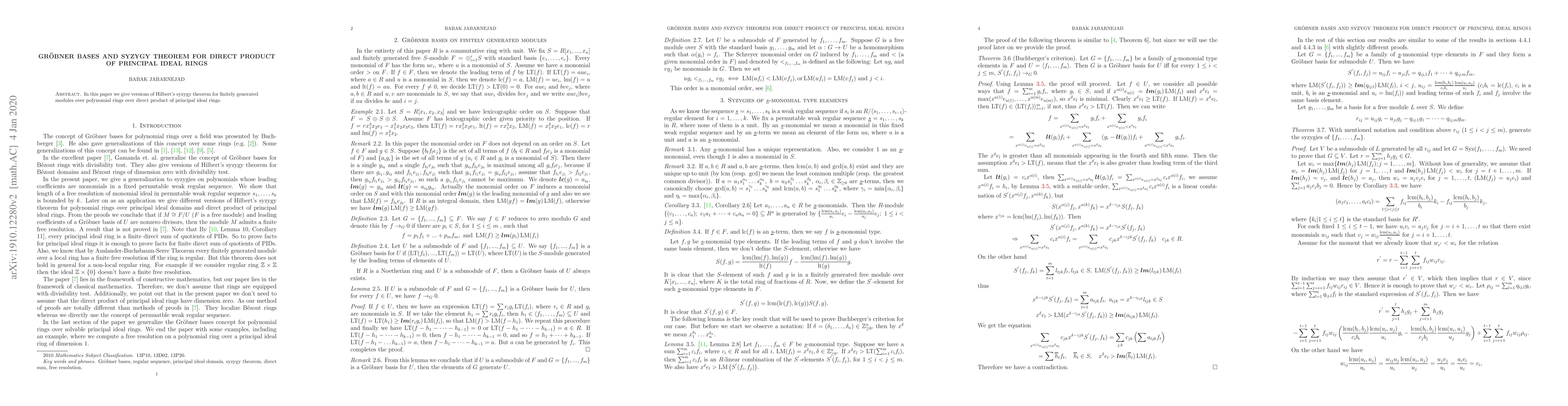 Summary: This paper presents Hilbert's syzygy theorem adapted for finitely generated modules over polynomial rings resulting from the direct product of principal ideal rings, focusing on Gröbner bases.