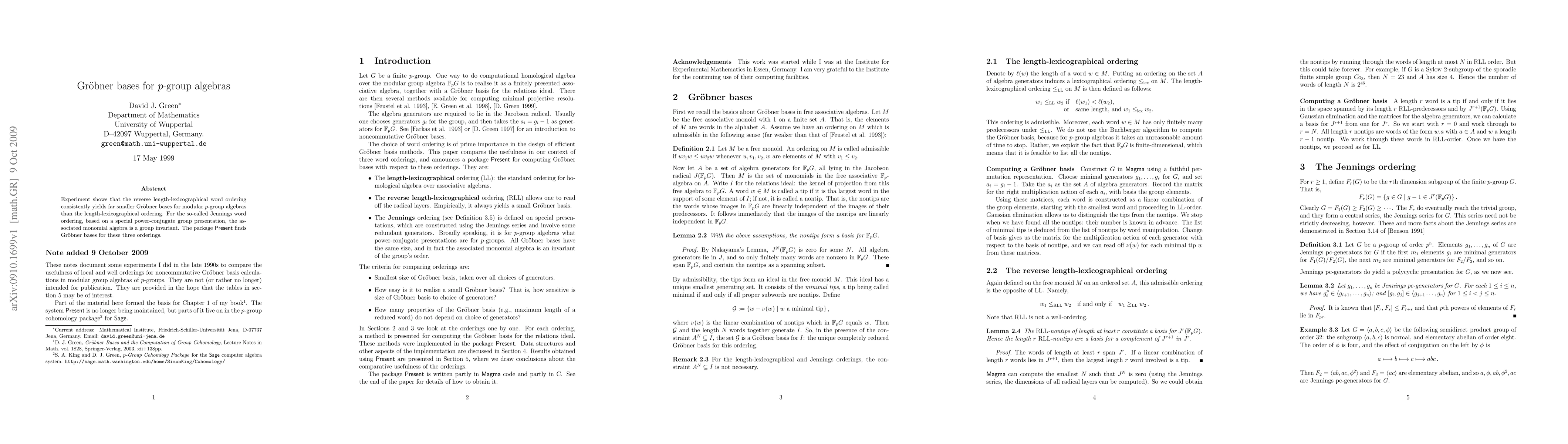 Experiment shows that the reverse length-lexicographical word ordering consistently yields far smaller Gr\"obner bases for modular p-group algebras than the length-lexicographical ordering. For the so-called Jennings word ordering, based on a special power-conjugate group presentation, the associated monomial algebra is a group invariant.