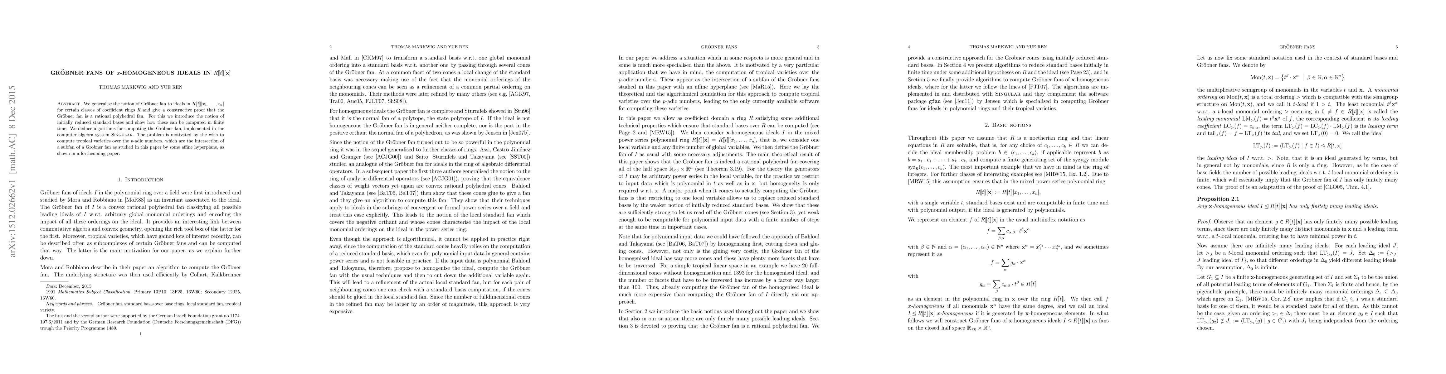 We generalise the notion of Gr\"obner fan to ideals in R[[t]][x_1,...,x_n] for certain classes of coefficient rings R and give a constructive proof that the Gr\"obner fan is a rational polyhedral fan. For this we introduce the notion of initially reduced standard bases and show how these can be computed in finite time. We deduce algorithms for computing the Gr\"obner fan, implemented in the computer algebra system Singular. The problem is motivated by the wish to compute tropical varieties over the p-adic numbers, which are the intersection of a subfan of a Gr\"obner fan as studied in this paper by some affine hyperplane, as shown in a forthcoming paper.