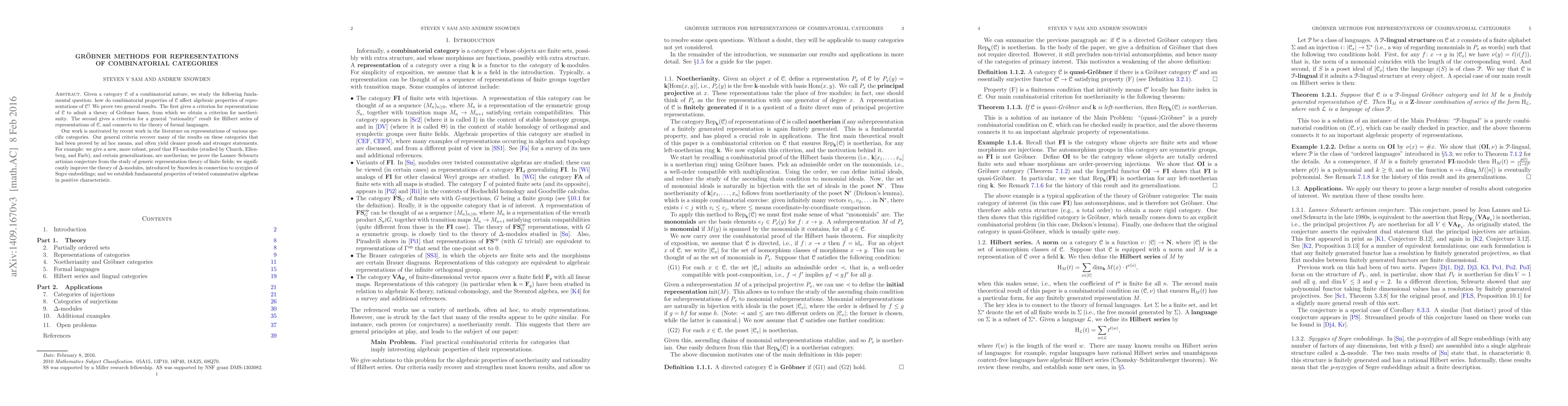 Given a category C of a combinatorial nature, we study the following fundamental question: how does the combinatorial behavior of C affect the algebraic behavior of representations of C? We prove two general results. The first gives a combinatorial criterion for representations of C to admit a theory of Gr\"obner bases. From this, we obtain a criterion for noetherianity of representations. The second gives a combinatorial criterion for a general "rationality" result for Hilbert series of representations of C. This criterion connects to the theory of formal languages, and makes essential use of results on the generating functions of languages, such as the transfer-matrix method and the Chomsky-Sch\"utzenberger theorem. Our work is motivated by recent work in the literature on representations of various specific categories. Our general criteria recover many of the results on these categories that had been proved by ad hoc means, and often yield cleaner proofs and stronger statements. For example: we give a new, more robust, proof that FI-modules (originally introduced by Church-Ellenberg-Farb), and a family of natural generalizations, are noetherian; we give an easy proof of a generalization of the Lannes-Schwartz artinian conjecture from the study of generic representation theory of finite fields; we significantly improve the theory of $\Delta$-modules, introduced by Snowden in connection to syzygies of Segre embeddings; and we establish fundamental properties of twisted commutative algebras in positive characteristic.