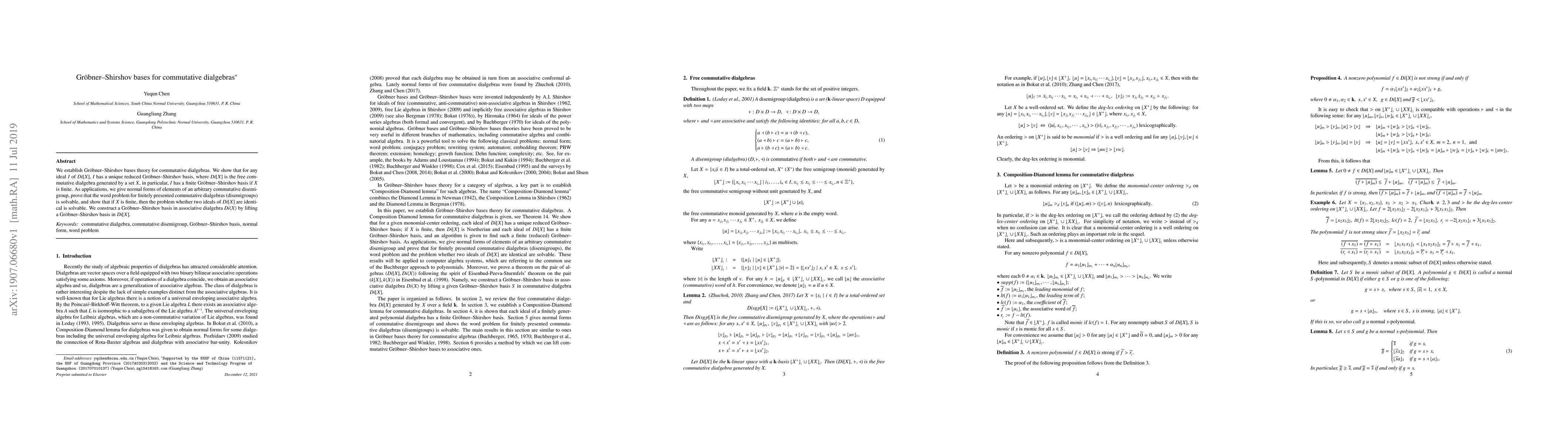 We establish Gr\"obner--Shirshov bases theory for commutative dialgebras. We show that for any ideal $I$ of $Di[X]$, $I$ has a unique reduced Gr\"obner--Shirshov basis, where $Di[X]$ is the free commutative dialgebra generated by a set $X$, in particular, $I$ has a finite Gr\"obner--Shirshov basis if $X$ is finite. As applications, we give normal forms of elements of an arbitrary commutative disemigroup, prove that the word problem for finitely presented commutative dialgebras (disemigroups) is solvable, and show that if $X$ is finite, then the problem whether two ideals of $Di[X]$ are identical is solvable. We construct a Gr\"obner--Shirshov basis in associative dialgebra $Di\langle X\rangle$ by lifting a Gr\"obner--Shirshov basis in $Di[X]$.