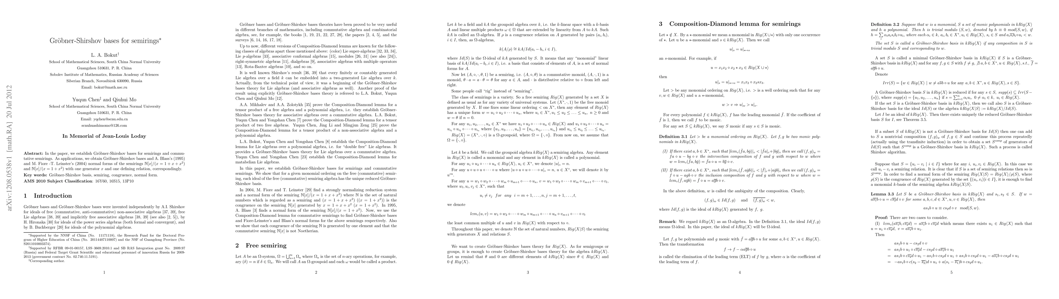 This paper introduces Gr\"obner-Shirshov bases for semirings and commutative semirings, providing normal forms for specific semirings such as $\mathbb{N}[x]/(x=1+x+x^2)$ and $\mathbb{N}[x]/(x=1+x^2)$.