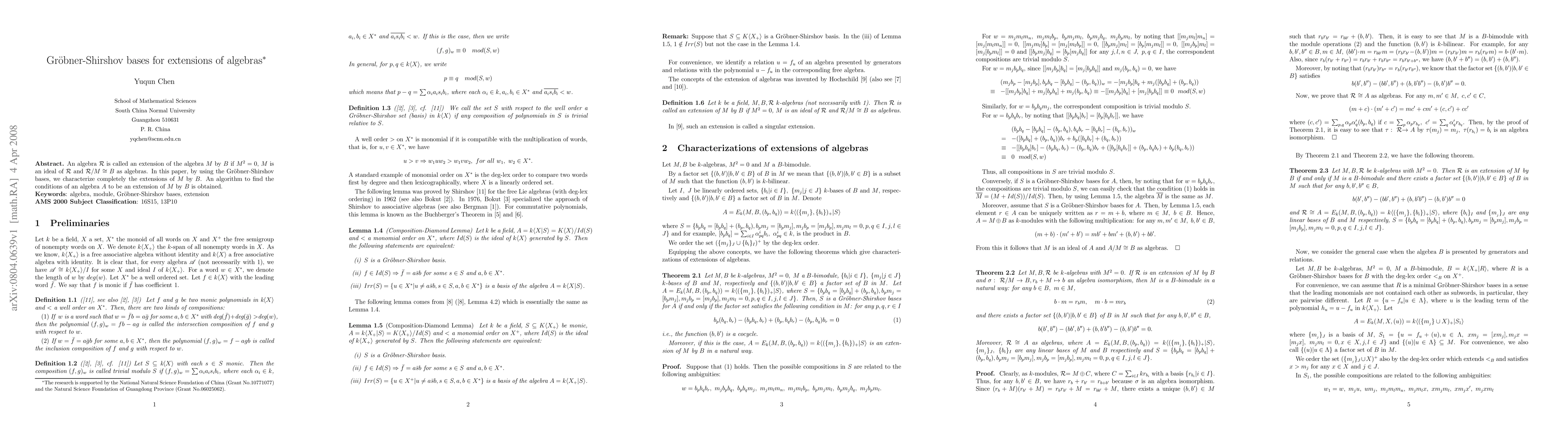 An algebra $\cal{R}$ is called an extension of the algebra $M$ by $B$ if $M^2=0$, $M$ is an ideal of $\cal{R}$ and $\cal{R}$$/M\cong B$ as algebras. In this paper, by using the Gr\"{o}bner-Shirshov bases, we characterize completely the extensions of $M$ by $B$. An algorithm to find the conditions of an algebra $A$ to be an extension of $M$ by $B$ is obtained.