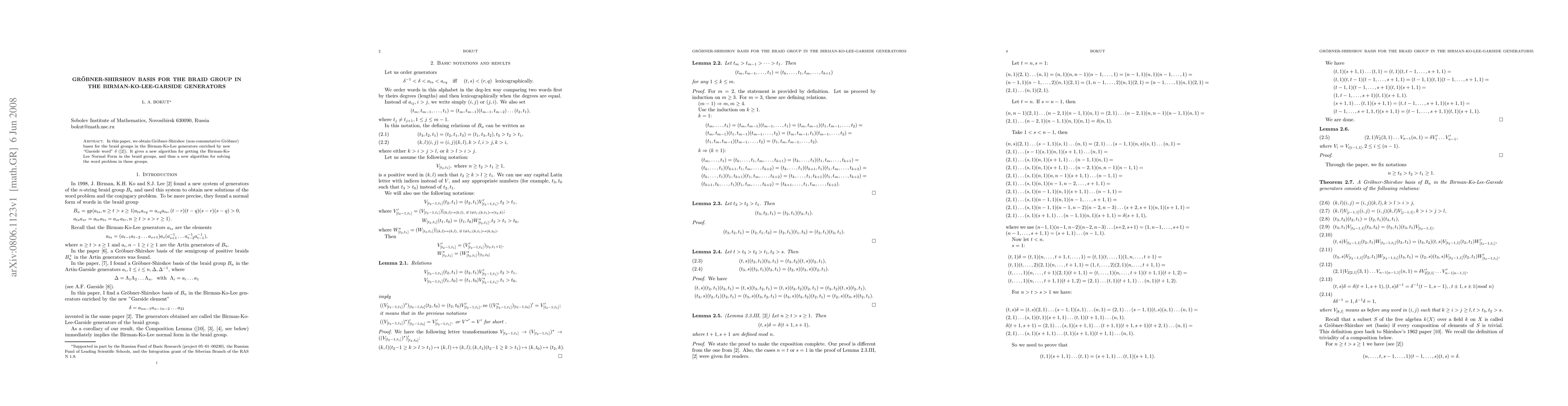 In this paper, we obtain Groebner-Shirshov (non-commutative Gr\"obner) bases for the braid groups in the Birman-Ko-Lee generators enriched by new ``Garside word" $\delta$. It gives a new algorithm for getting the Birman-Ko-Lee Normal Form in the braid groups, and thus a new algorithm for solving the word problem in these groups.
