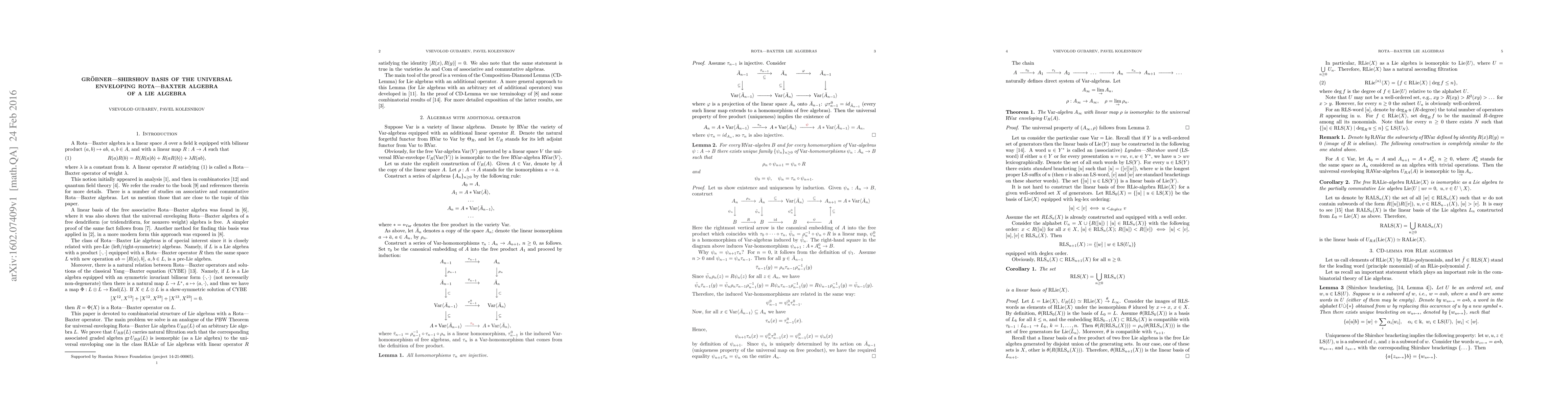 Consider the class RBLie of Lie algebras equipped with a Rota---Baxter operator. Then the forgetful functor RBLie --> Lie has a left adjoint one denoted by $U_{RB}(\cdot)$. We prove an "operator" analogue of the Poincare---Birkhoff---Witt theorem for $U_{RB}(L)$, where $L$ is an arbitrary Lie algebra, by means of Gr\"obner---Shirshov bases theory for Lie algebras with an additional operator.