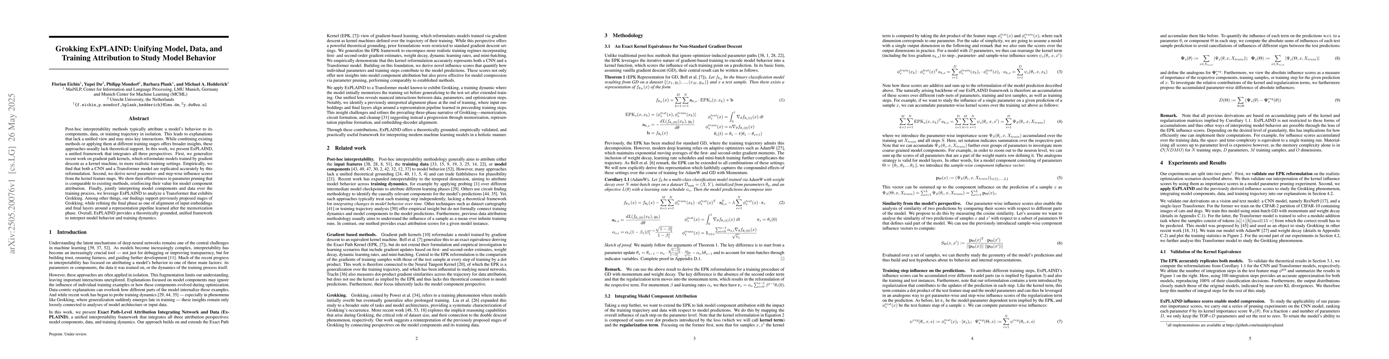 Post-hoc interpretability methods typically attribute a model's behavior to its components, data, or training trajectory in isolation. This leads to explanations that lack a unified view and may miss key interactions. While combining existing methods or applying them at different training stages offers broader insights, these approaches usually lack theoretical support. In this work, we present ExPLAIND, a unified framework that integrates all three perspectives. First, we generalize recent work on gradient path kernels, which reformulate models trained by gradient descent as a kernel machine, to more realistic training settings. Empirically, we find that both a CNN and a Transformer model are replicated accurately by this reformulation. Second, we derive novel parameter- and step-wise influence scores from the kernel feature maps. We show their effectiveness in parameter pruning that is comparable to existing methods, reinforcing their value for model component attribution. Finally, jointly interpreting model components and data over the training process, we leverage ExPLAIND to analyze a Transformer that exhibits Grokking. Among other things, our findings support previously proposed stages of Grokking, while refining the final phase as one of alignment of input embeddings and final layers around a representation pipeline learned after the memorization phase. Overall, ExPLAIND provides a theoretically grounded, unified framework to interpret model behavior and training dynamics.
