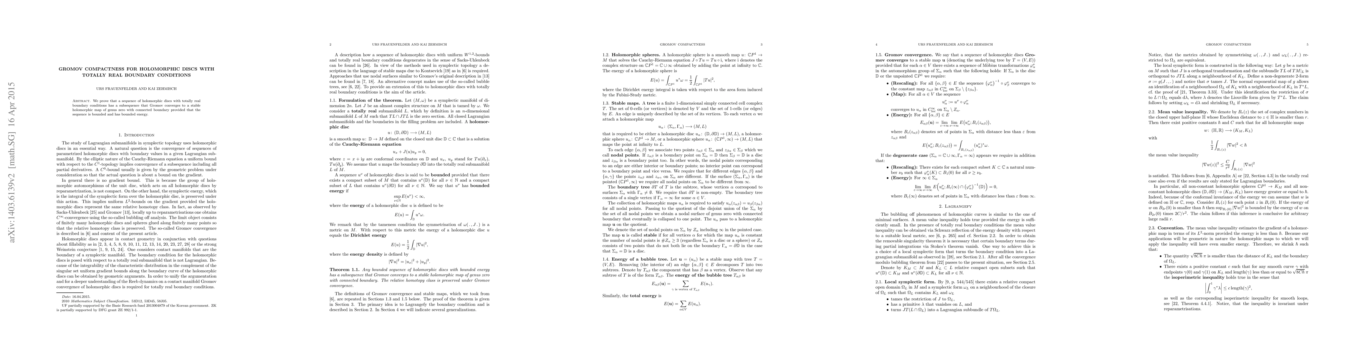Summary: This paper establishes Gromov compactness for holomorphic discs with totally real boundary conditions, proving that bounded and energy-constrained sequences converge to stable holomorphic maps of genus zero with connected boundaries.