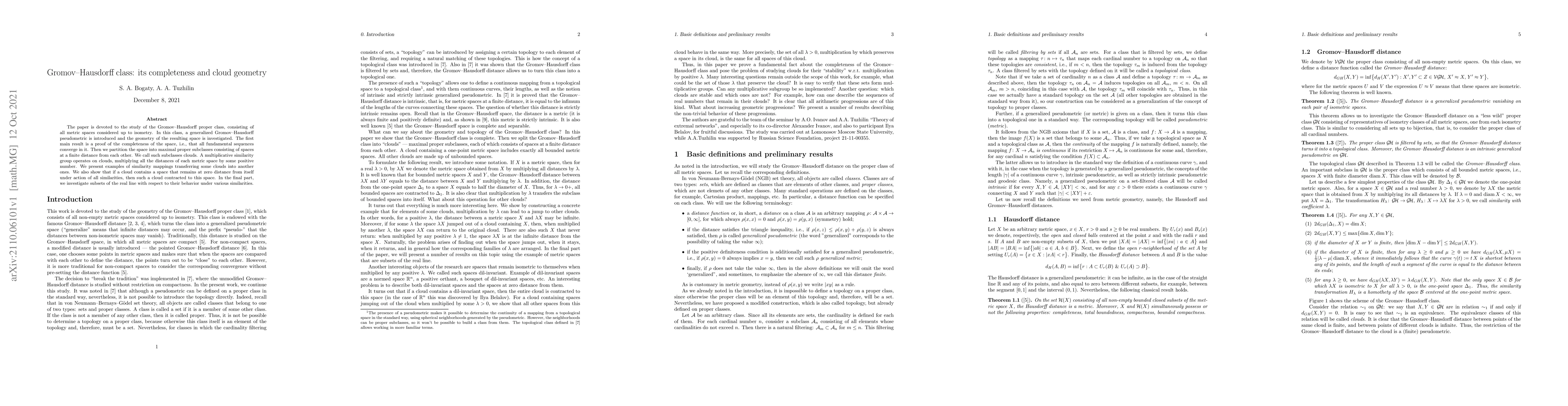 This paper explores the Gromov-Hausdorff proper class of metric spaces, proving its completeness and introducing a generalized Gromov-Hausdorff pseudometric. It partitions the space into "clouds," maximal subclasses of metric spaces at finite distance, and examines how similarity transformations affect these clouds.