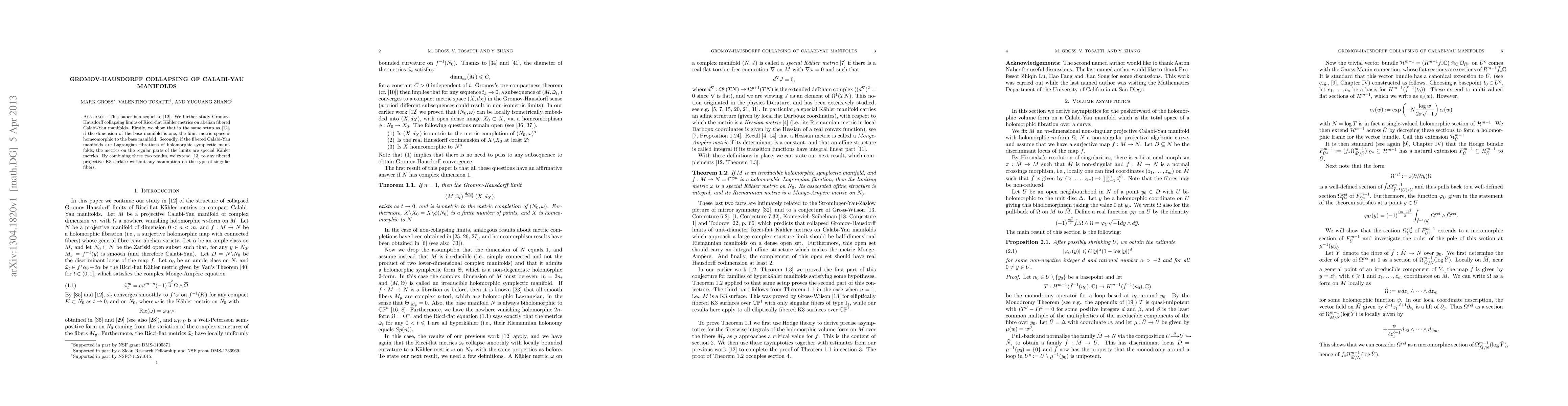 This paper investigates Gromov-Hausdorff collapsing limits of Ricci-flat Kähler metrics on abelian fibered Calabi-Yau manifolds, showing that the limit metric space is homeomorphic to the base manifold when the base dimension is one, and that special Kähler metrics arise in Lagrangian fibrations of holomorphic symplectic manifolds.