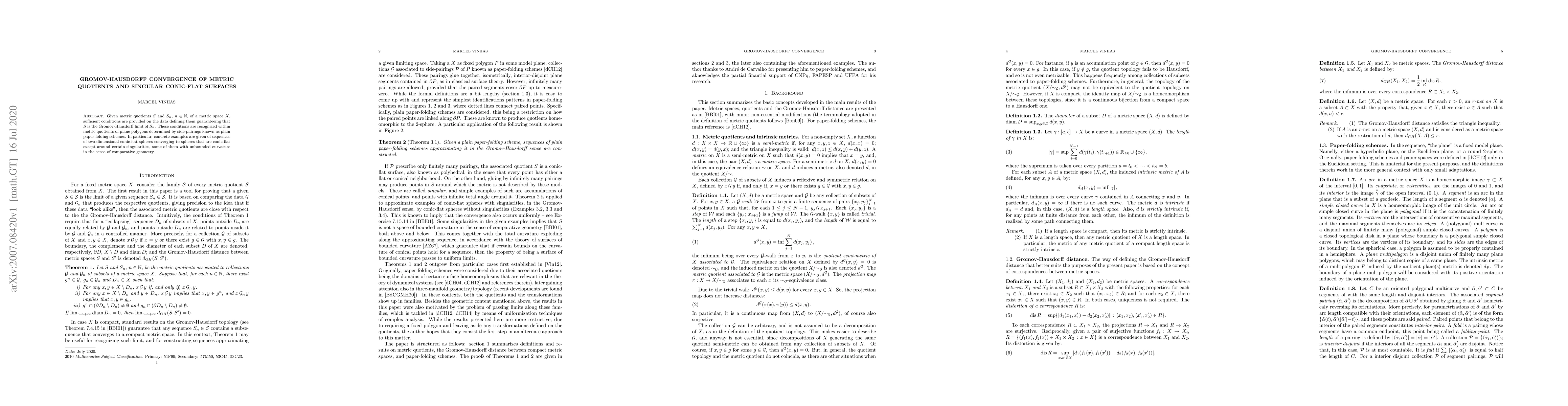 Given metric quotients $S$ and $S_n$, $n \in \mathbb{N}$, of a metric space $X$, sufficient conditions are provided on the data defining them guaranteeing that $S$ is the Gromov-Hausdorff limit of $S_n$. These conditions are recognized within metric quotients of plane polygons determined by side-pairings known as plain paper-folding schemes. In particular, concrete examples are given of sequences of two-dimensional conic-flat spheres converging to spheres that are conic-flat except around certain singularities, some of them with unbounded curvature in the sense of comparative geometry.
