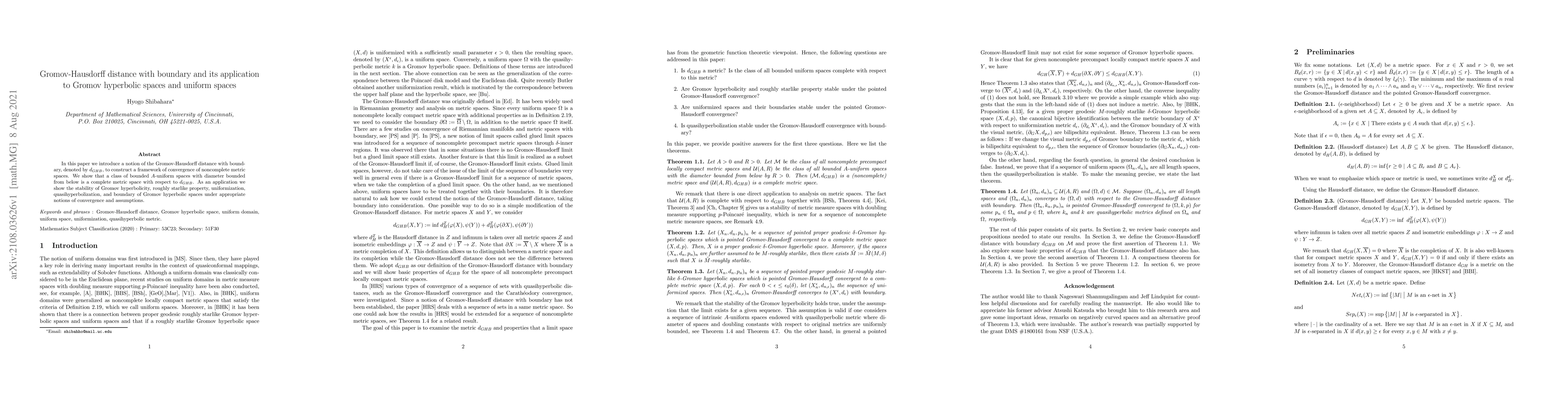 In this paper we introduce a notion of the Gromov-Hausdorff distance with boundary, denoted by $d_{GHB}$, to construct a framework of convergence of noncomplete metric spaces. We show that a class of bounded $A$-uniform spaces with diameter bounded from below is a complete metric space with respect to $d_{GHB}$. As an application we show the stability of Gromov hyperbolicity, roughly starlike property, uniformization, quasihyperbolization, and boundary of Gromov hyperbolic spaces under appropriate notions of convergence and assumptions.
