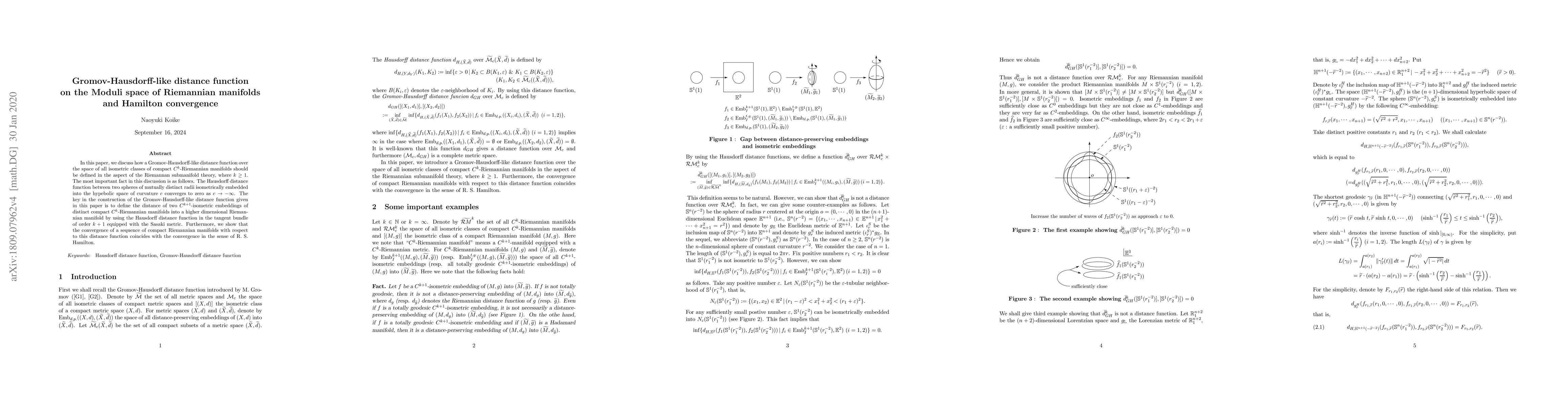 This paper proposes a Gromov-Hausdorff-like distance function for compact $C^k$-Riemannian manifolds, focusing on Riemannian submanifold theory, where $k\geq 1$. It demonstrates that the Hausdorff distance between spheres of distinct radii embedded in hyperbolic space converges to zero as curvature becomes highly negative.