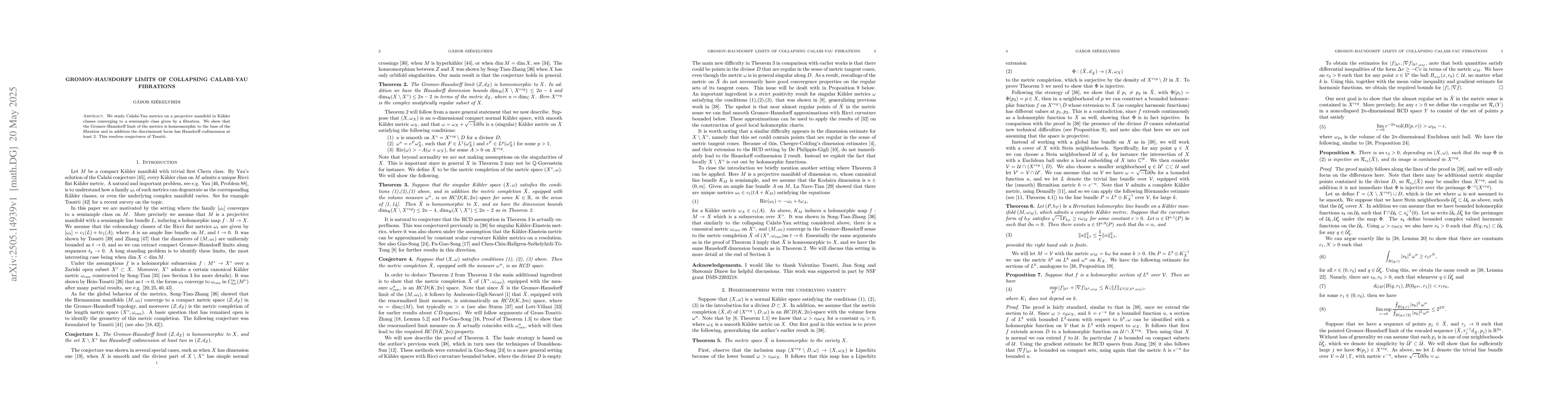 The paper demonstrates that the Gromov-Hausdorff limits of Calabi-Yau metrics on projective manifolds, under specified conditions, exhibit a homeomorphism to the base of the fibration with a high Hausdorff codimension for the discriminant locus.