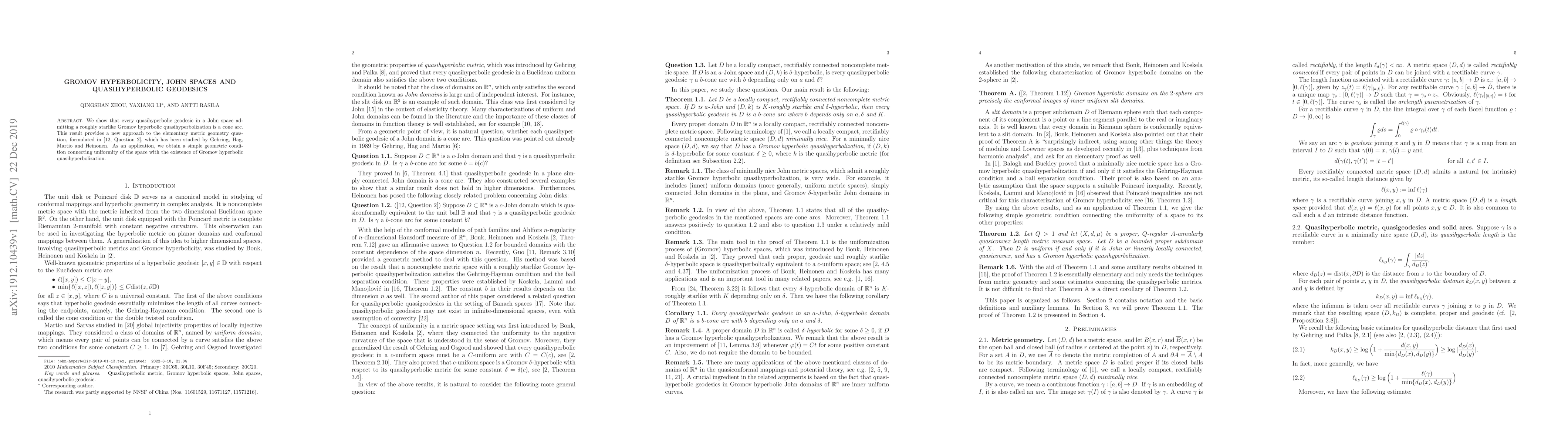 We show that every quasihyperbolic geodesic in a John space admitting a roughly starlike Gromov hyperbolic quasihyperbolization is a cone arc. This result provides a new approach to the elementary metric geometry question, formulated in \cite[Question 2]{Hei89}, which has been studied by Gehring, Hag, Martio and Heinonen. As an application, we obtain a simple geometric condition connecting uniformity of the space with the existence of Gromov hyperbolic quasihyperbolization.