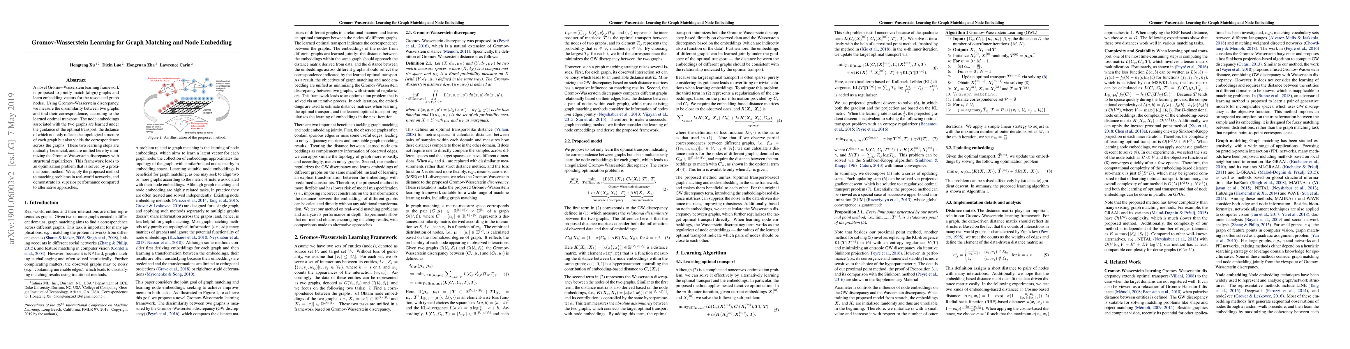 This paper introduces a Gromov-Wasserstein learning framework for aligning graphs and embedding graph nodes, using optimal transport to measure graph dissimilarity and correspondence. The method demonstrates superior performance in real-world network matching tasks compared to other approaches.