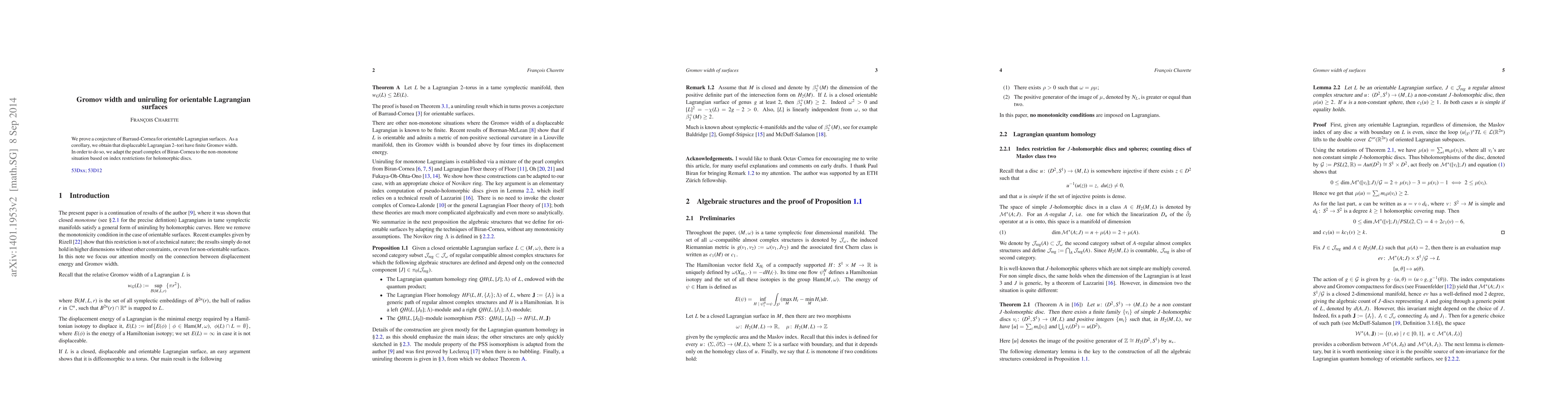 We prove a conjecture of Barraud-Cornea for orientable Lagrangian surfaces. As a corollary, we obtain that displaceable Lagrangian 2--tori have finite Gromov width. In order to do so, we adapt the pearl complex of Biran-Cornea to the non-monotone situation based on index restrictions for holomorphic discs.