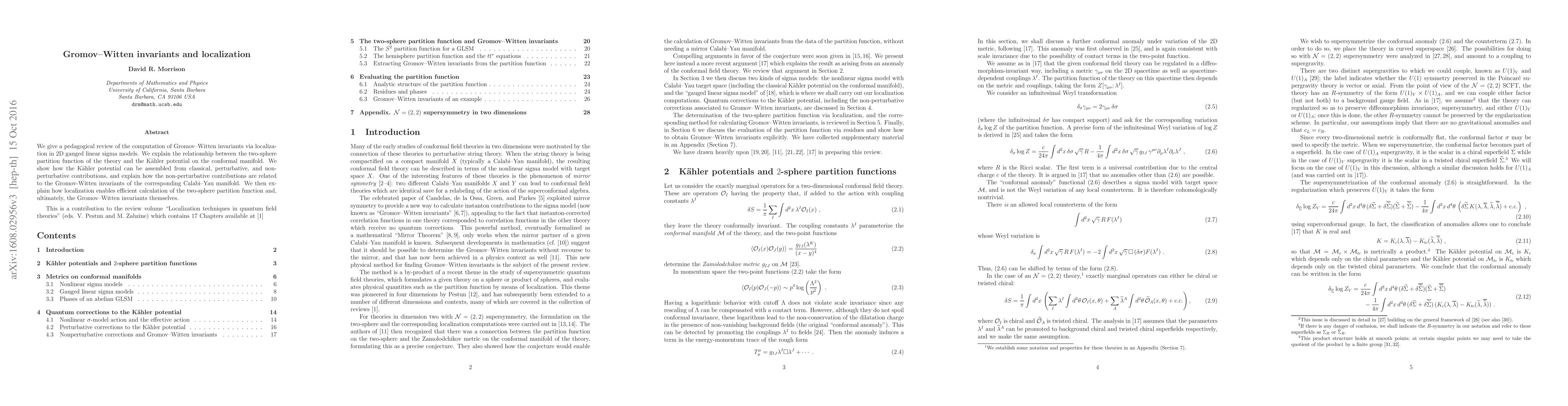 We give a pedagogical review of the computation of Gromov-Witten invariants via localization in 2D gauged linear sigma models. We explain the relationship between the two-sphere partition function of the theory and the Kahler potential on the conformal manifold. We show how the Kahler potential can be assembled from classical, perturbative, and non-perturbative contributions, and explain how the non-perturbative contributions are related to the Gromov-Witten invariants of the corresponding Calabi-Yau manifold. We then explain how localization enables efficient calculation of the two-sphere partition function and, ultimately, the Gromov-Witten invariants themselves.