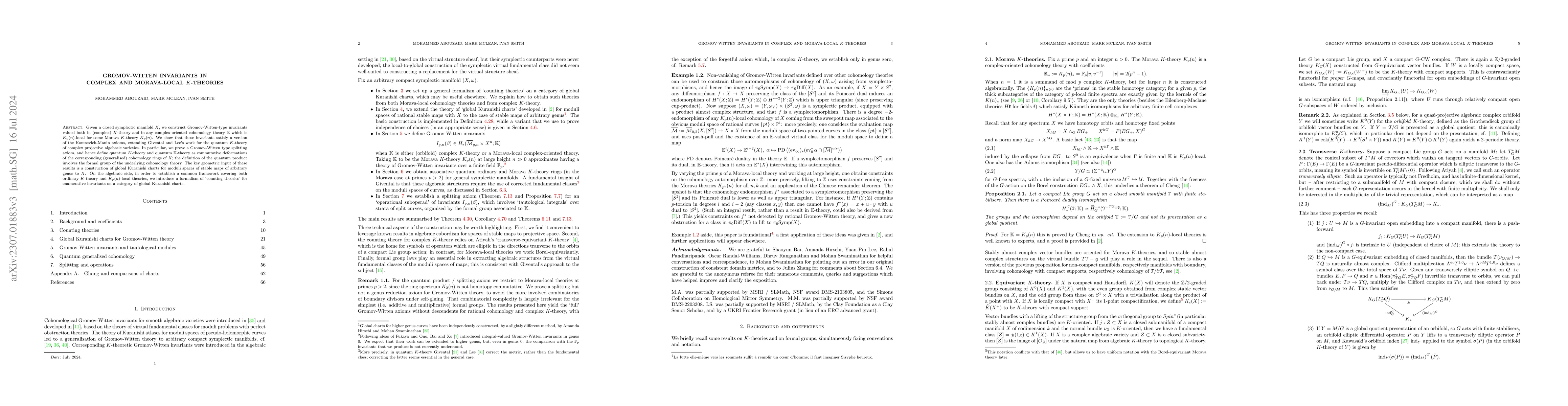 Given a closed symplectic manifold $X$, we construct Gromov-Witten-type invariants valued both in (complex) $K$-theory and in any complex-oriented cohomology theory $\mathbb{K}$ which is $K_p(n)$-local for some Morava $K$-theory $K_p(n)$. We show that these invariants satisfy a version of the Kontsevich-Manin axioms, extending Givental and Lee's work for the quantum $K$-theory of complex projective algebraic varieties. In particular, we prove a Gromov-Witten type splitting axiom, and hence define quantum $K$-theory and quantum $\mathbb{K}$-theory as commutative deformations of the corresponding (generalised) cohomology rings of $X$; the definition of the quantum product involves the formal group of the underlying cohomology theory. The key geometric input to these results is a construction of global Kuranishi charts for moduli spaces of stable maps of arbitrary genus to $X$. On the algebraic side, in order to establish a common framework covering both ordinary $K$-theory and $K_p(n)$-local theories, we introduce a formalism of `counting theories' for enumerative invariants on a category of global Kuranishi charts.