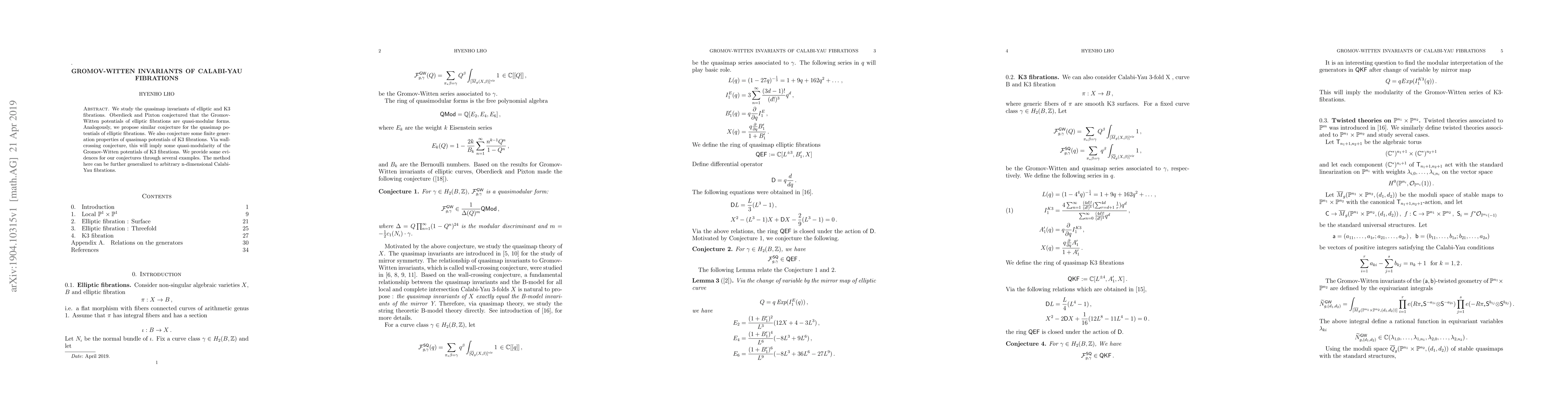 This paper investigates quasimap invariants for elliptic and K3 fibrations, proposing conjectures that Gromov-Witten potentials for elliptic fibrations are quasi-modular forms and suggesting similar properties for K3 fibrations, supported by examples and applicable to higher-dimensional Calabi-Yau fibrations.