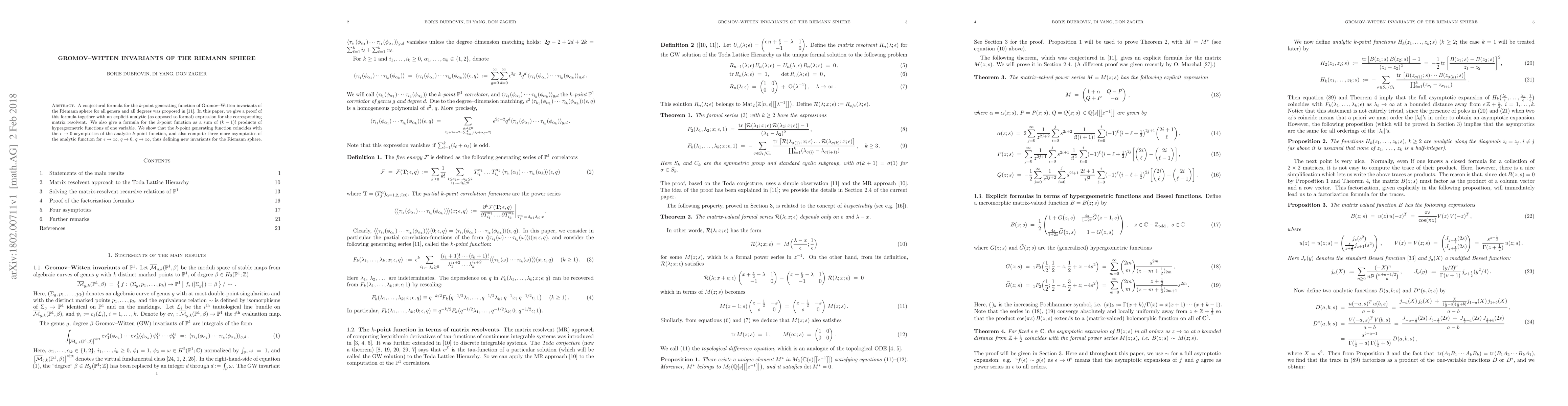 This paper proves a conjectured formula for the $k$-point generating function of Gromov--Witten invariants of the Riemann sphere, providing an explicit analytic expression and a sum of hypergeometric functions. It also computes several asymptotics, defining new invariants.