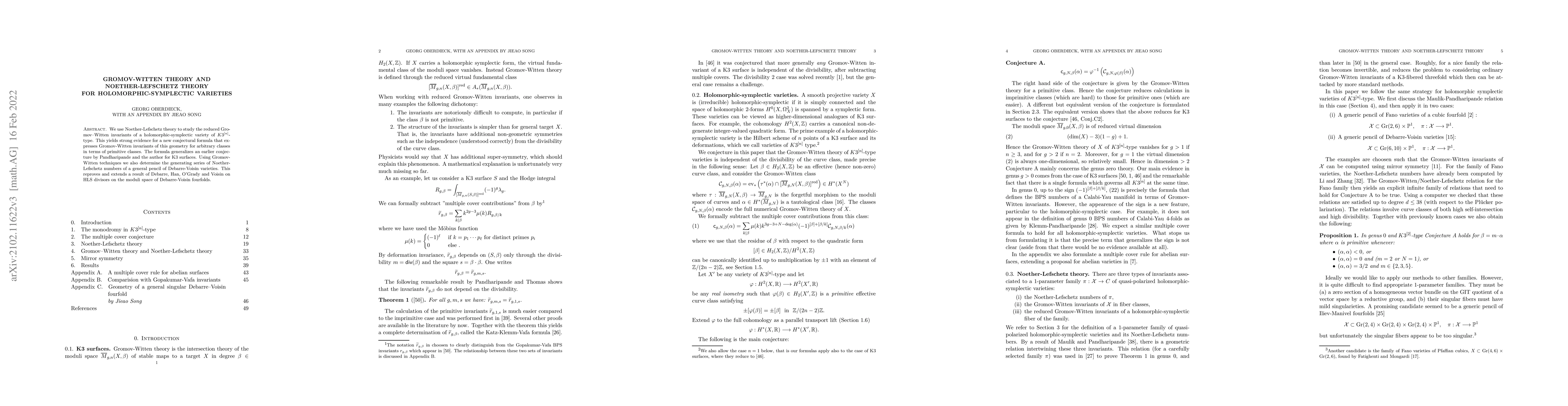 This paper applies Noether-Lefschetz theory to explore the reduced Gromov-Witten invariants of holomorphic-symplectic varieties of $K3^{[n]}$-type, proposing a new conjecture that generalizes Gromov-Witten invariants in terms of primitive classes. It also determines the generating series of Noether-Lefschetz numbers for Debarre-Voisin fourfolds, extending previous results.