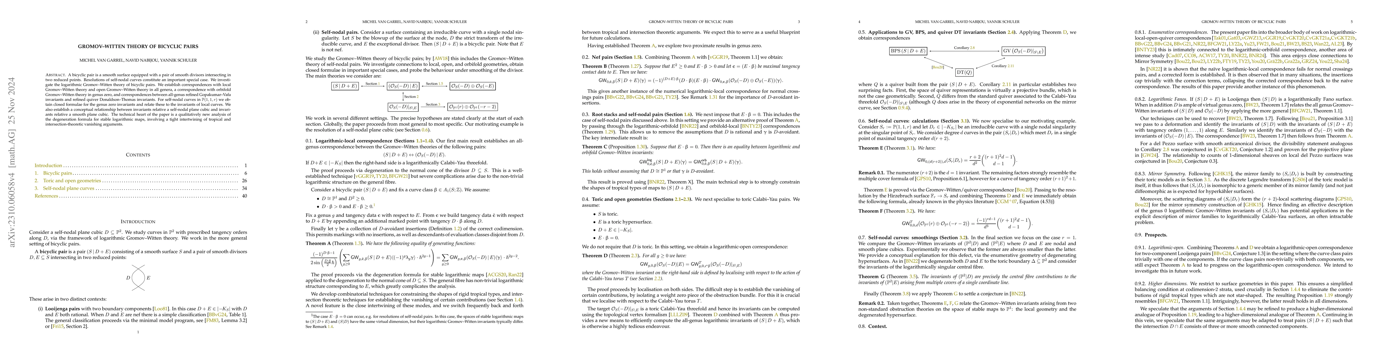 A bicyclic pair is a smooth surface equipped with a pair of smooth divisors intersecting in two reduced points. Resolutions of self-nodal curves constitute an important special case. We investigate the logarithmic Gromov-Witten theory of bicyclic pairs. We establish all-genus correspondences with local Gromov-Witten theory and open Gromov-Witten theory, and a genus zero correspondence with orbifold Gromov-Witten theory. For self-nodal curves in $\mathbb{P}(1,1,r)$ we obtain a closed formula for the genus zero invariants and relate these to the invariants of local curves. We also establish a conceptual relationship to the invariants obtained by smoothing the self-nodal curve. The technical heart of the paper is a qualitatively new analysis of the degeneration formula for stable logarithmic maps, complemented by torus localisation and scattering techniques.