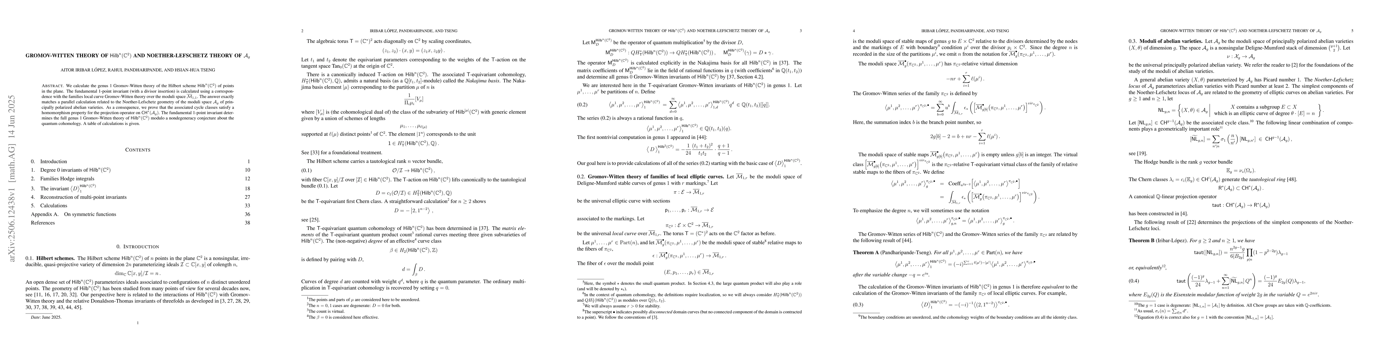 This paper calculates the genus 1 Gromov-Witten theory of the Hilbert scheme of points in the complex plane, matching it with Noether-Lefschetz theory of the moduli space of principally polarized abelian varieties. The findings prove a homomorphism property for cycle classes, with the fundamental 1-point invariant determining the full genus 1 theory modulo a quantum cohomology nondegeneracy conjecture.