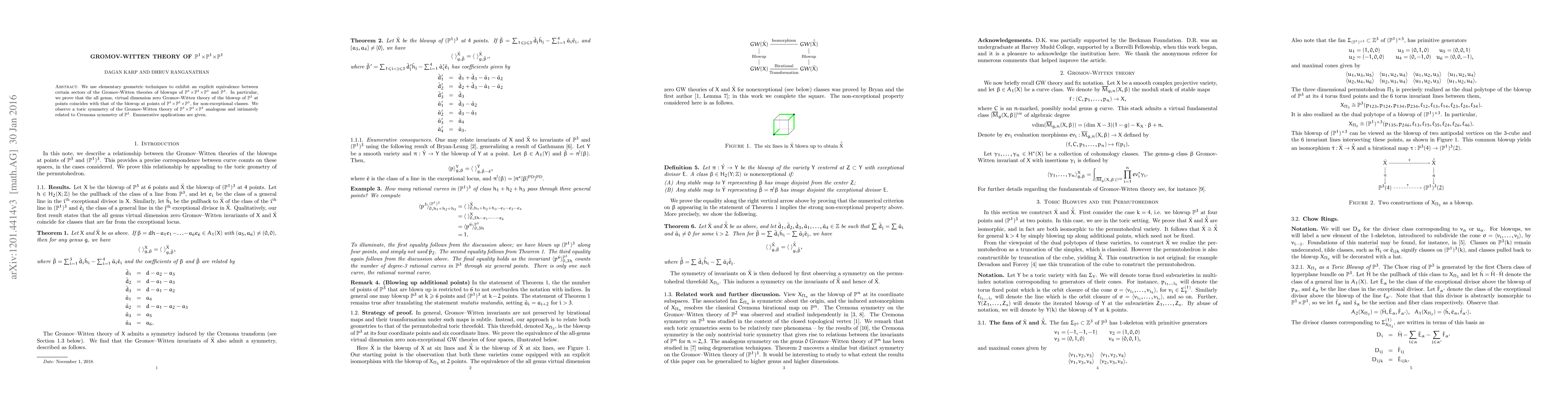 This paper establishes an explicit equivalence between the Gromov-Witten theories of blown-up versions of P^1xP^1xP^1 and P^3, demonstrating their matching all-genus, virtual dimension zero theories for non-exceptional classes. It also highlights a toric symmetry in P^1xP^1xP^1 analogous to P^3's Cremona symmetry and provides enumerative applications.