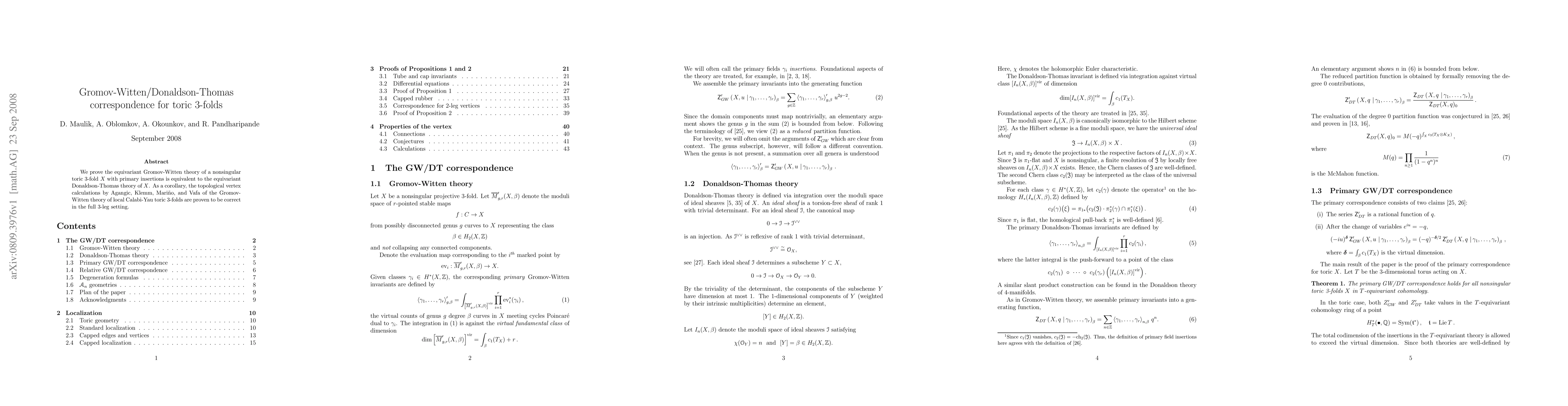 We prove the equivariant Gromov-Witten theory of a nonsingular toric 3-fold X with primary insertions is equivalent to the equivariant Donaldson-Thomas theory of X. As a corollary, the topological vertex calculations by Agangic, Klemm, Marino, and Vafa of the Gromov-Witten theory of local Calabi-Yau toric 3-folds are proven to be correct in the full 3-leg setting.