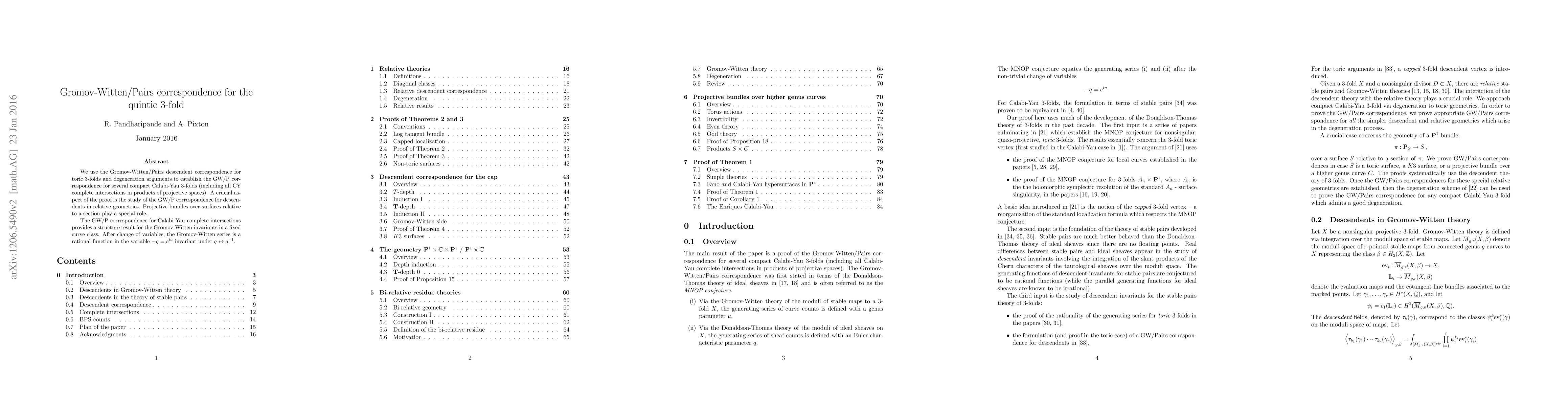 Summary: This paper establishes the Gromov-Witten/Pairs correspondence for Calabi-Yau 3-folds, including complete intersections in projective spaces, using toric geometry and degeneration techniques. The proof emphasizes the study of relative geometries and projective bundles over surfaces. The correspondence reveals a structure for Gromov-Witten invariants in fixed curve classes, leading to a rational function form of the Gromov-Witten series.