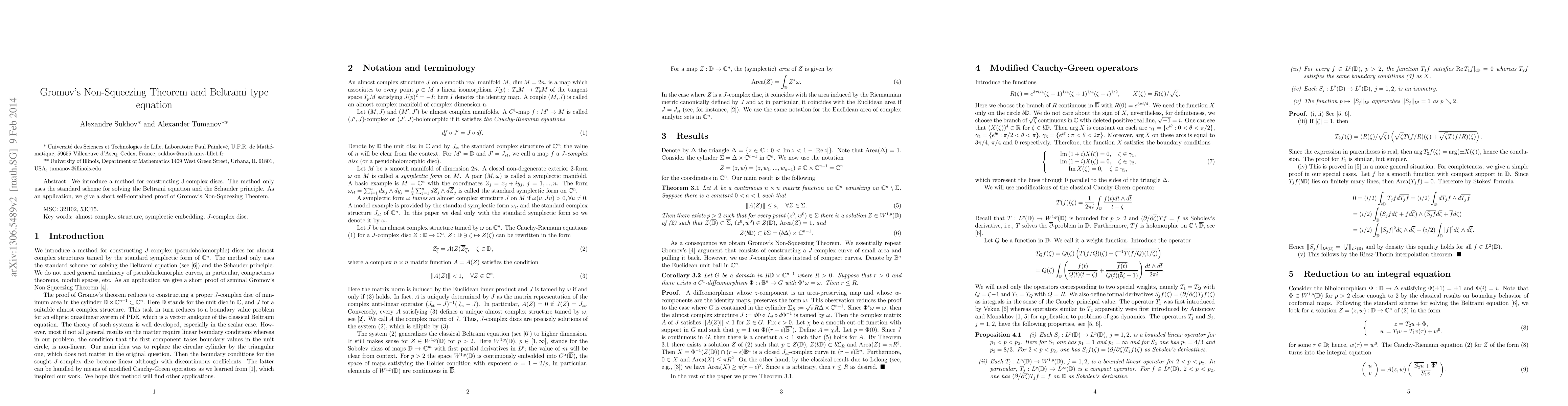This paper presents a method to construct J-complex discs using the standard scheme for solving the Beltrami equation and the Schauder principle, and applies this method to provide a concise proof of Gromov's Non-Squeezing Theorem.