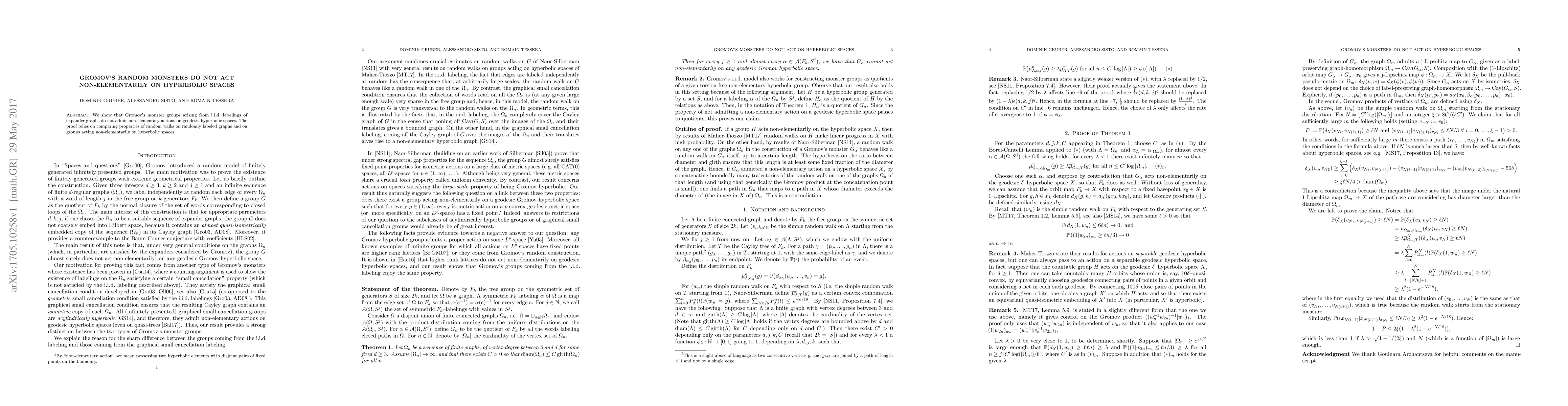 Summary: Gromov's random monster groups, derived from independent identically distributed labelings of expander graphs, do not support non-elementary actions on geodesic hyperbolic spaces, as demonstrated through a comparative analysis of random walks.