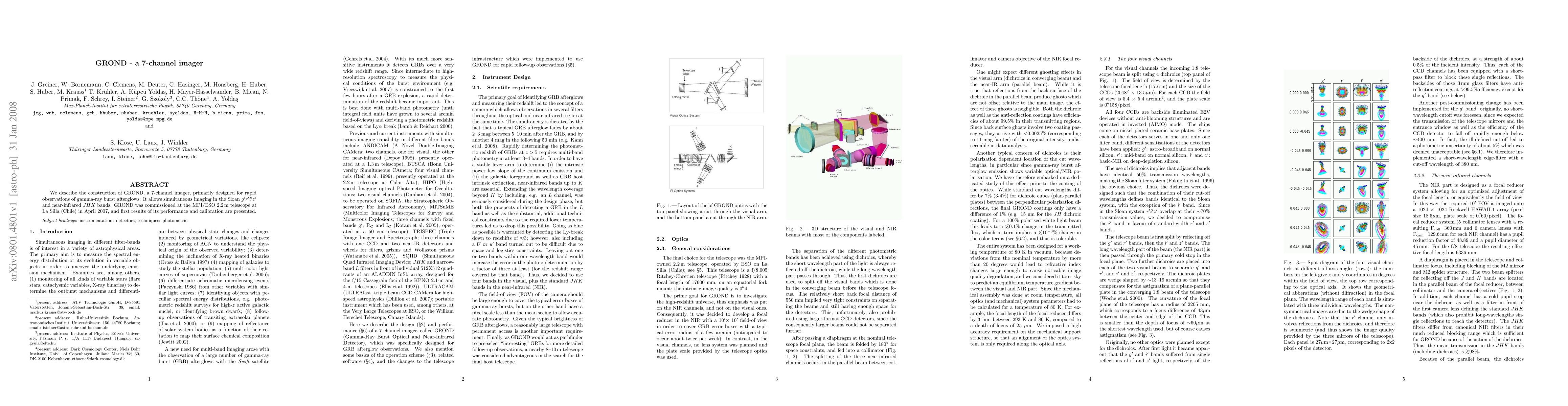 GROND is a 7-channel imager designed for rapid observations of gamma-ray burst afterglows, enabling simultaneous imaging across the Sloan g'r'i'z' and near-infrared JHK bands. Commissioned at the MPI/ESO 2.2m telescope in Chile in April 2007, initial results on its performance and calibration are presented.